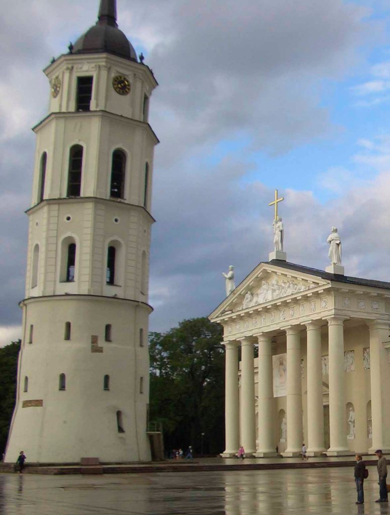 La Catedral, construida en el s. XIII en la fe cristiana sobre un asentamiento pagano, fue reconstruida a finales del s. XVIII con un estilo clasicista barroco francés por el arquitecto Laurynas Stouka-Gucevicius, mediante la recreación de un peculiar templo griego con un pórtico clásico de columnas que lo rodean perimetralmente. El Campanario formaba parte de las fortificaciones y ahora queda separado de la Catedral en la misma plaza, que está presidida por una estatua del gran duque Gediminas (gran Duque de Lituania entre 1316 y 1341).