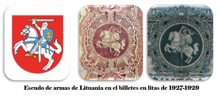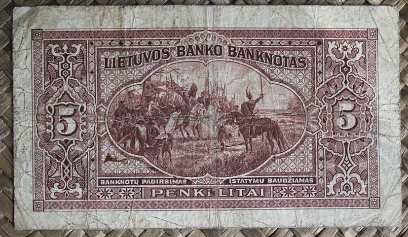 El de 5 litas de 1929 nos muestra en su anverso al Gran Duque Vytautas el Grande, héroe nacional del s.XIV y en el lado opuesto el escudo de armas de Lituania. En su reverso un grabado de la preparación de la batalla medieval de Grunwald (Batalla de Žalgiris -1410, de la guerra polaco-lituana-teutónica que enfrentó al Reino de Polonia junto al Gran Ducado de Lituania contra la Orden de los Caballeros Teutónicos) recreando a los guerreros sobre sus caballerías y estandartes al viento.