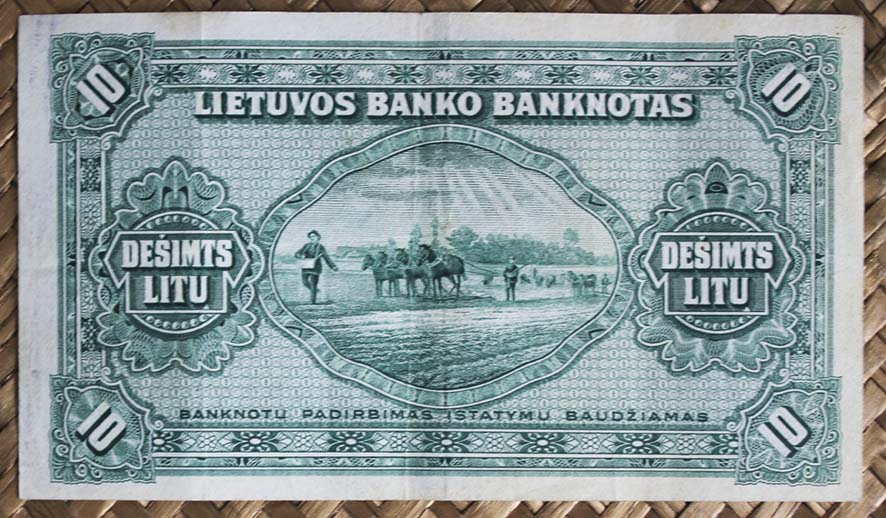 El billete de 10 litas de Lituania de 1927 nos muestra al anverso un medallón con el escudo de armas del país. En su reverso una imagen de la campiña lituana con campesinos labrando los campos.