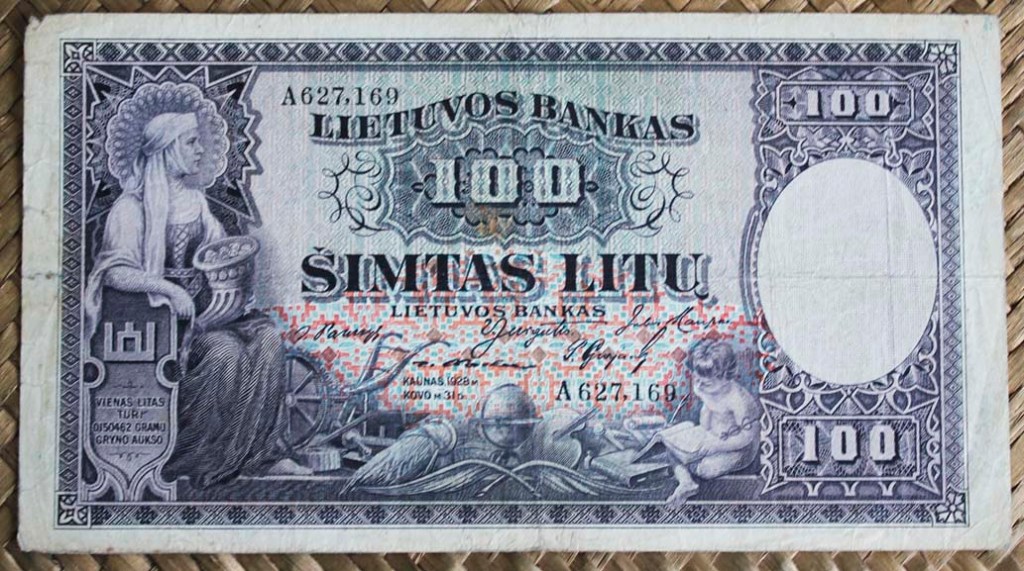 El de 100 litas de 1928 nos muestra en su anverso la alegoría de una dama con el cuerno de la fortuna y un niño rodeado de alegorías a las ciencias y las artes. En su reverso el edificio que albergaba a primeros de s. XX el Club de Comercio de Vilnius (Merchants’ Club). Fue impreso por la empresa Bradbury, Wilkinson & Co. de Inglaterra.