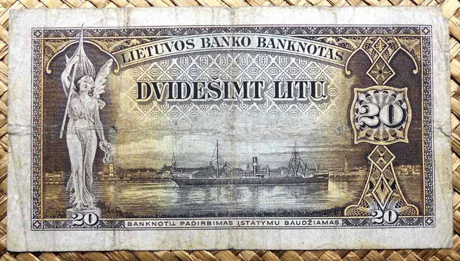 El billete de 20 litas de Lituania de 1930 nos muestra en su anverso a Vytautas el Grande y la Iglesia de la Asunción (también conocida por el nombre del duque lituano) en Kaunas. En su reverso un barco mercante de vapor al centro y una estatua de la Libertad en el lado izquierdo. Es también una edición conmemorativa del 500 aniversario de la muerte de Vytautas.