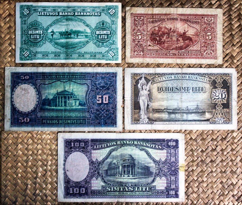 Contemplamos los billetes de Lituania de 5 litai de 1929, 10 litu de 1927, 20 litu de 1930, 50 litu de 1928 y 100 litu de 1928.