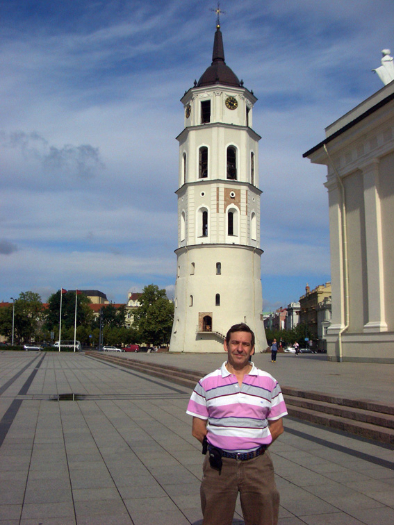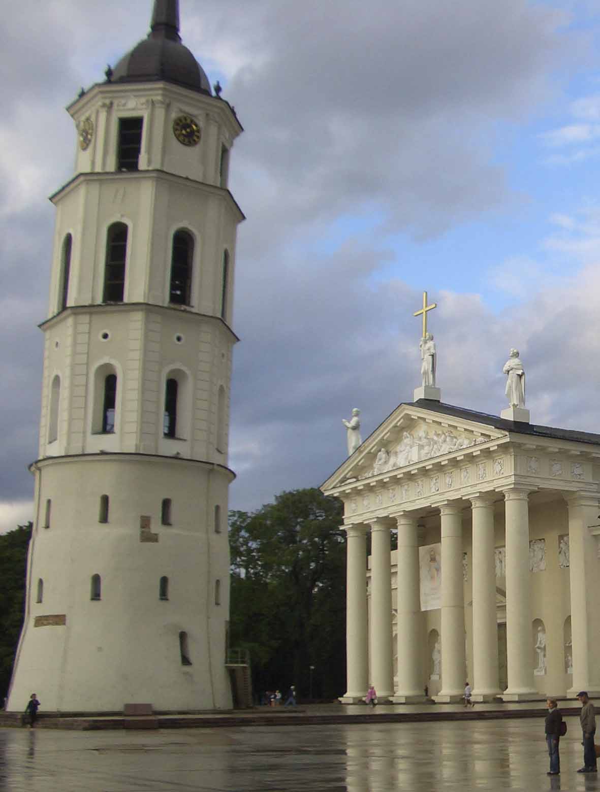 La Catedral, construida en el s. XIII en la fe cristiana sobre un asentamiento pagano, fue reconstruida a finales del s. XVIII con un estilo clasicista barroco francés por el arquitecto Laurynas Stouka-Gucevicius, mediante la recreación de un peculiar templo griego con un pórtico clásico de columnas que lo rodean perimetralmente. El Campanario formaba parte de las fortificaciones y ahora queda separado de la Catedral en la misma plaza, que está presidida por una estatua del gran duque Gediminas (gran Duque de Lituania entre 1316 y 1341).