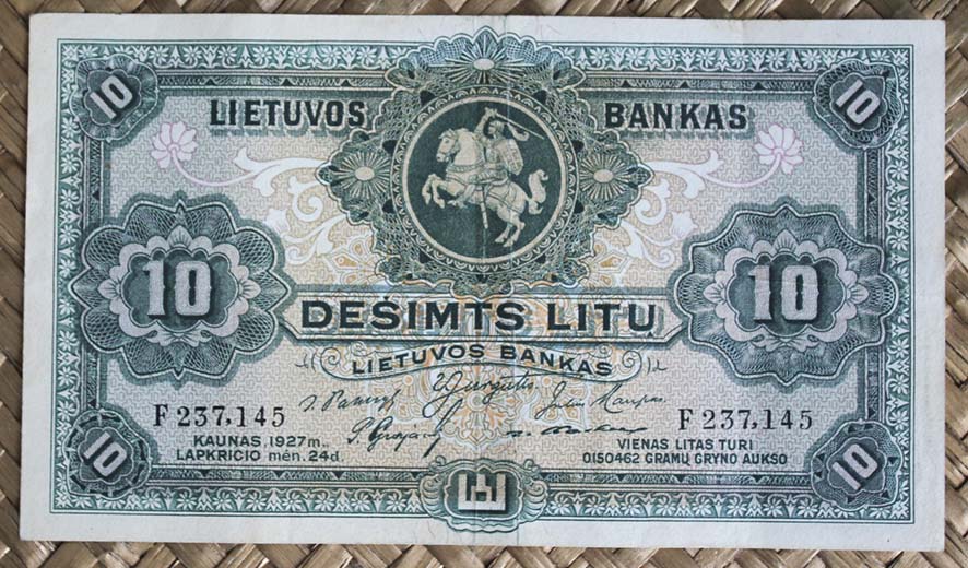 El billete de 10 litas de Lituania de 1927 nos muestra al anverso un medallón con el escudo de armas del país. En su reverso una imagen de la campiña lituana con campesinos labrando los campos.
