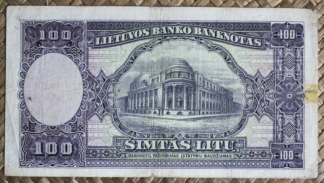 El de 100 litas de 1928 nos muestra en su anverso la alegoría de una dama con el cuerno de la fortuna y un niño rodeado de alegorías a las ciencias y las artes. En su reverso el edificio que albergaba a primeros de s. XX el Club de Comercio de Vilnius (Merchants’ Club). Fue impreso por la empresa Bradbury, Wilkinson & Co. de Inglaterra.