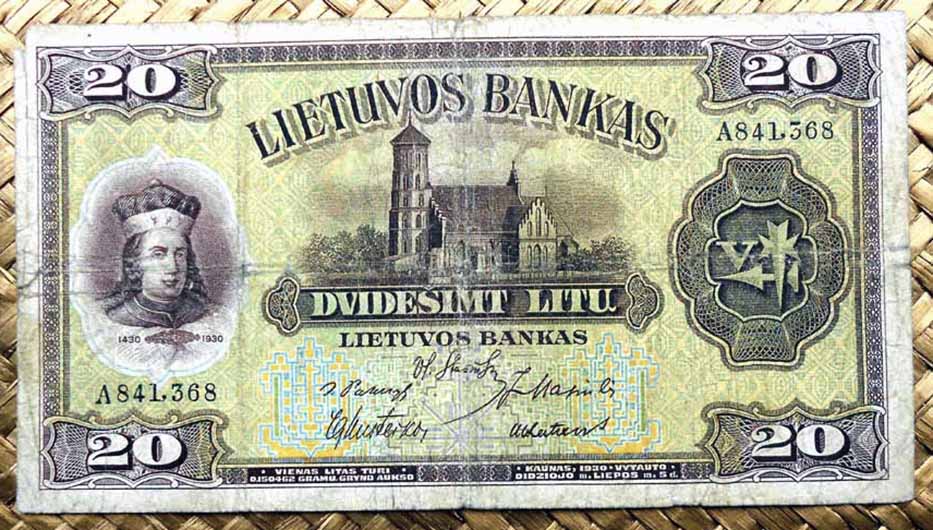 El billete de 20 litas de Lituania de 1930 nos muestra en su anverso a Vytautas el Grande y la Iglesia de la Asunción (también conocida por el nombre del duque lituano) en Kaunas. En su reverso un barco mercante de vapor al centro y una estatua de la Libertad en el lado izquierdo. Es también una edición conmemorativa del 500 aniversario de la muerte de Vytautas.