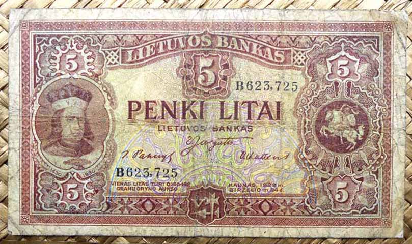 El de 5 litas de 1929 nos muestra en su anverso al Gran Duque Vytautas el Grande, héroe nacional del s.XIV y en el lado opuesto el escudo de armas de Lituania. En su reverso un grabado de la preparación de la batalla medieval de Grunwald (Batalla de Žalgiris -1410, de la guerra polaco-lituana-teutónica que enfrentó al Reino de Polonia junto al Gran Ducado de Lituania contra la Orden de los Caballeros Teutónicos) recreando a los guerreros sobre sus caballerías y estandartes al viento.