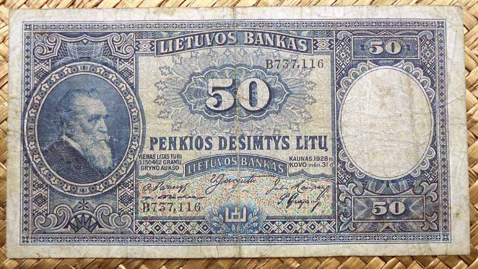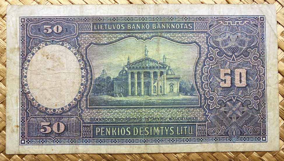 El billete de 50 litas de Lituania de 1928 nos muestra en su anverso a Jonas Basanavicius, político que firmó en 1918 la primera Acta de Independencia lituana. En su reverso la Catedral de Vilnius, con una entrada muy “ateniense”.