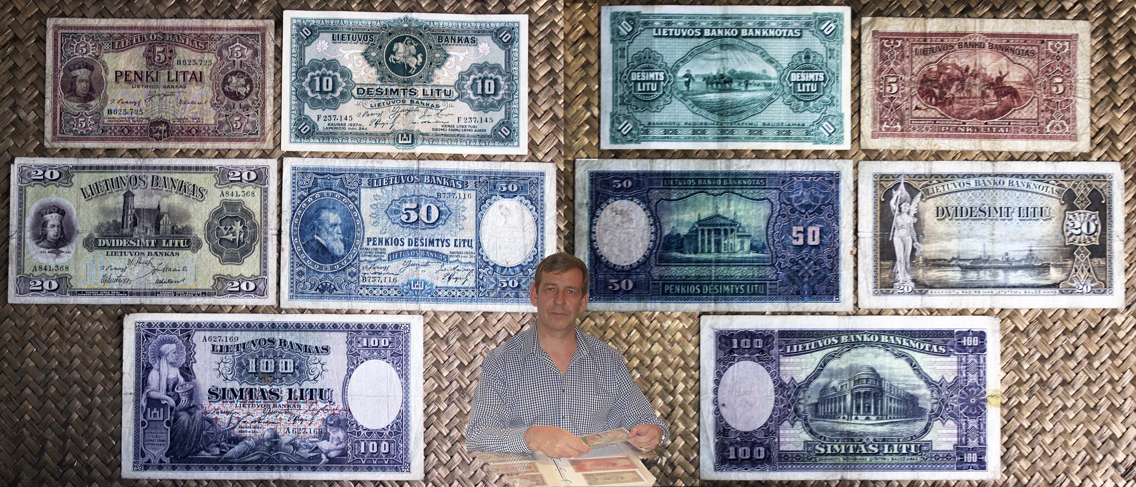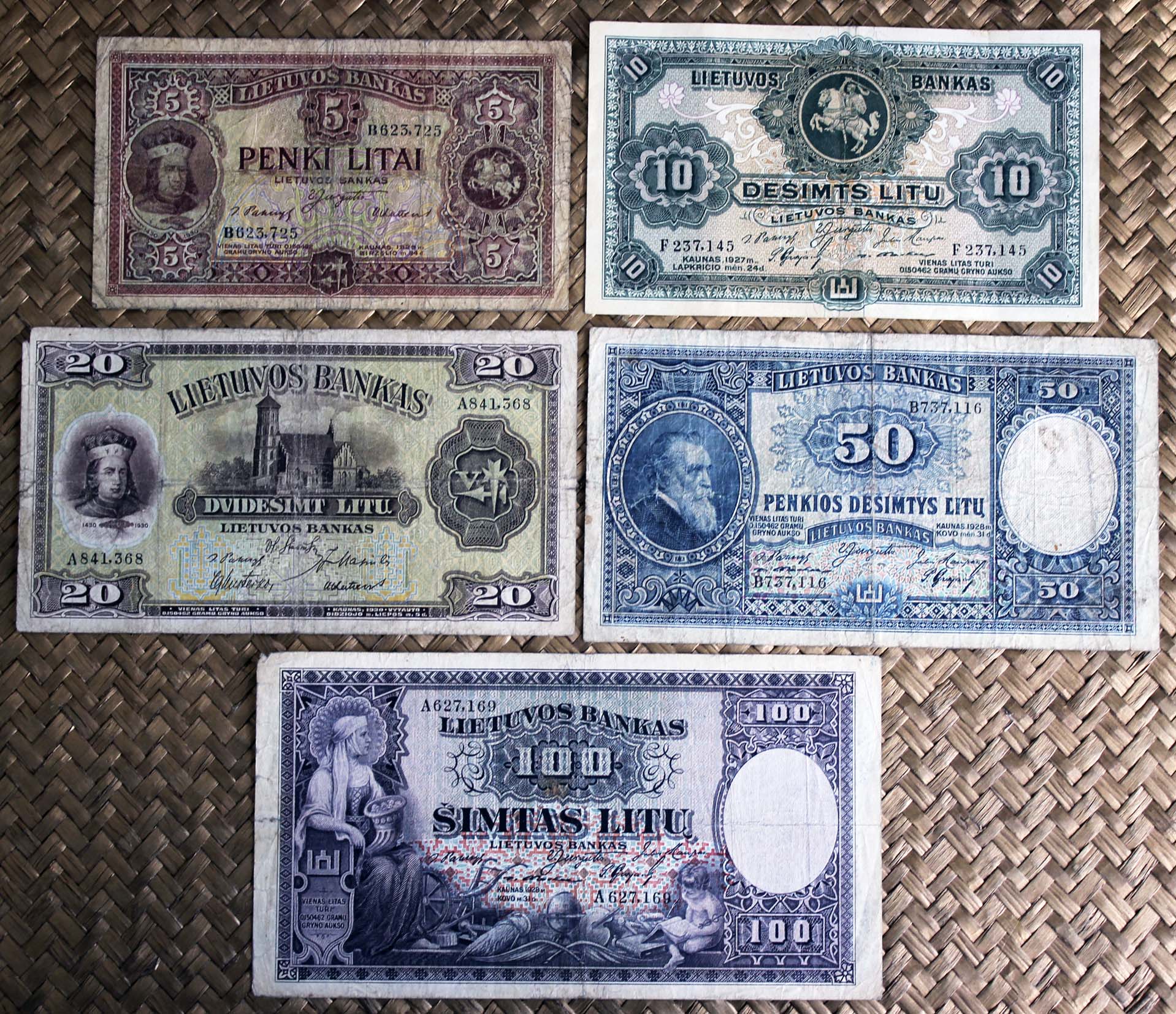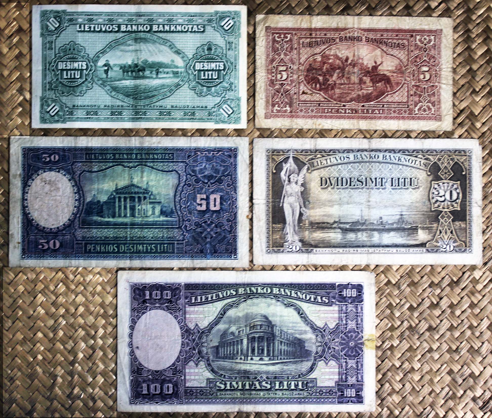 Contemplamos los billetes de Lituania de 5 litai de 1929, 10 litu de 1927, 20 litu de 1930, 50 litu de 1928 y 100 litu de 1928.
