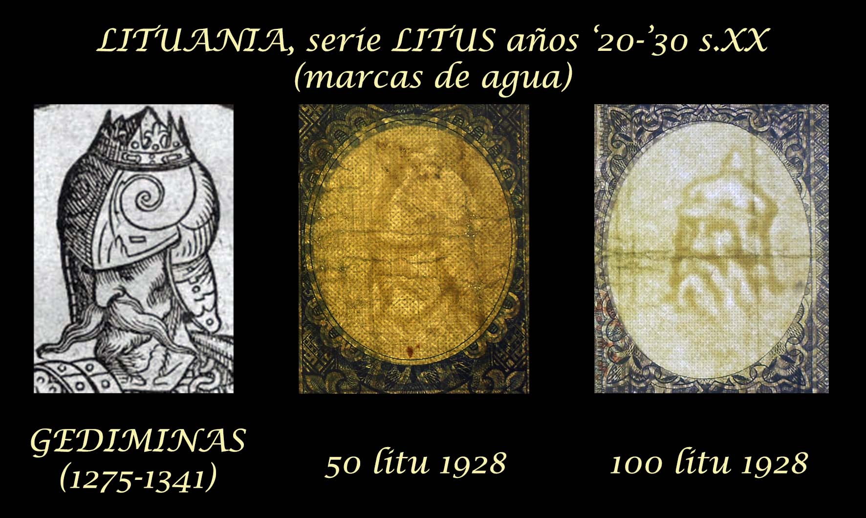 Solo los valores mayores poseen marca de agua. Tanto el billete de 50 litas como el de 100 litas nos ofrecen el torso de Gediminas (1275-1341).
