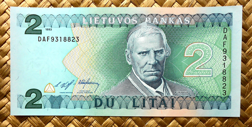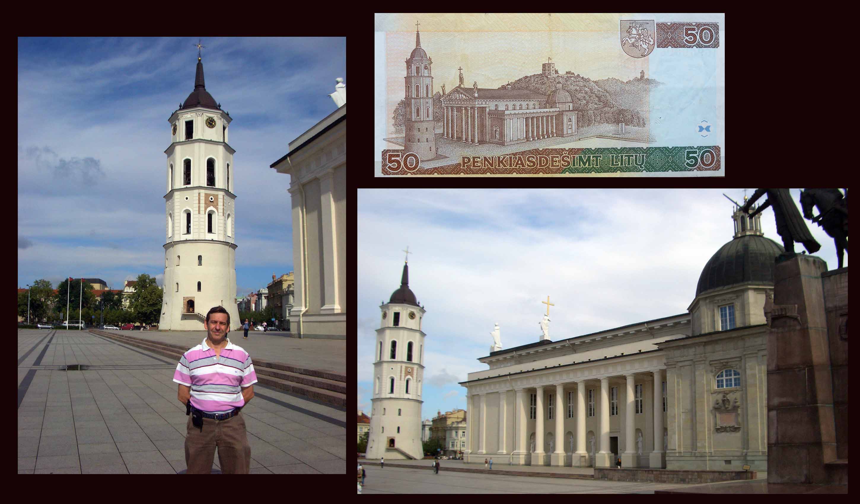 El billete de Lituania de 50 litus de 1993 nos ofrece en su reverso una perspectiva de la plaza de Vilnius con la Catedral, el Campanario en su primer plano.