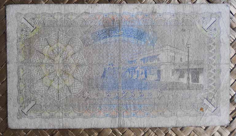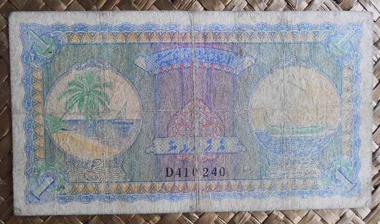 El billete de 1 rupia de Maldivas de 1960 nos muestra en el anverso los medallones comunes a toda la serie, palmera con pequeño velero a la izquierda y barco pesquero a la derecha. En su reverso nos ofrece el edificio Casa de la Aduana, luego sería la oficina de Correos e incluso la Oficina del Primer Ministro, a su lado el bastión o muralla de la ciudad llamado “Bodu Koattey Buruzu”.