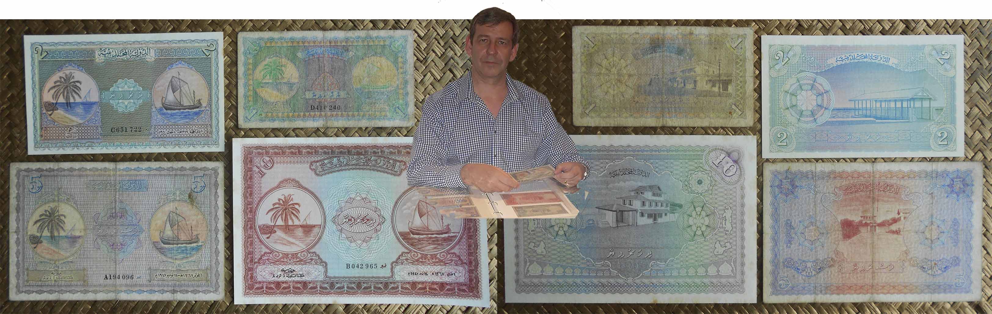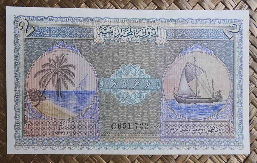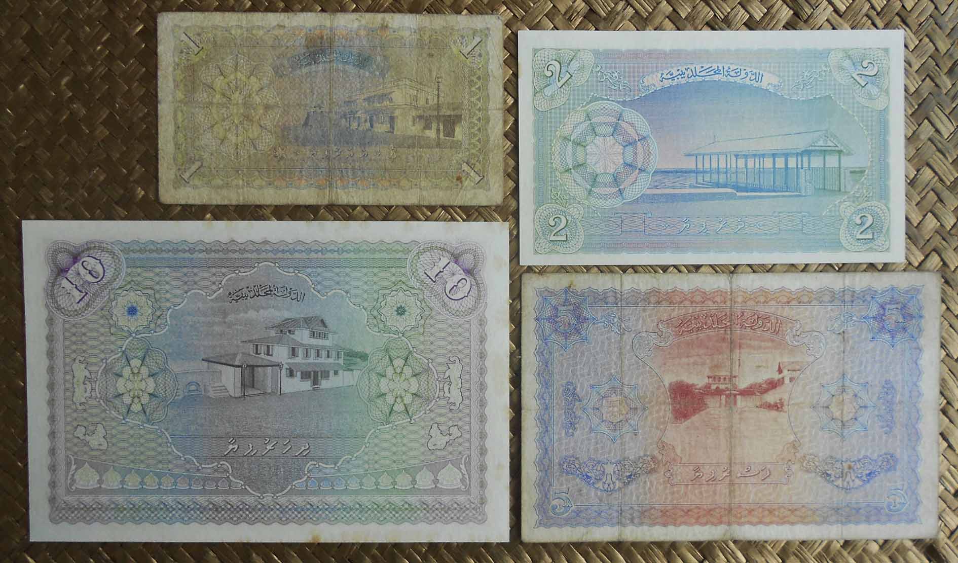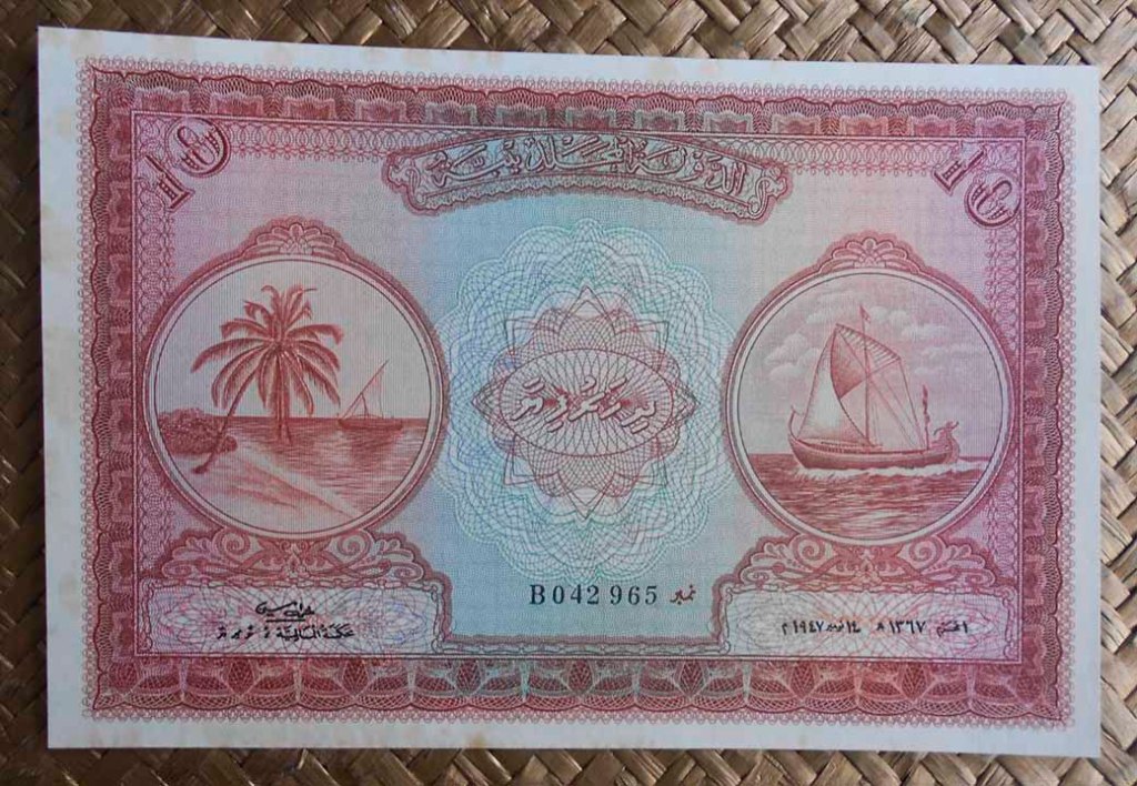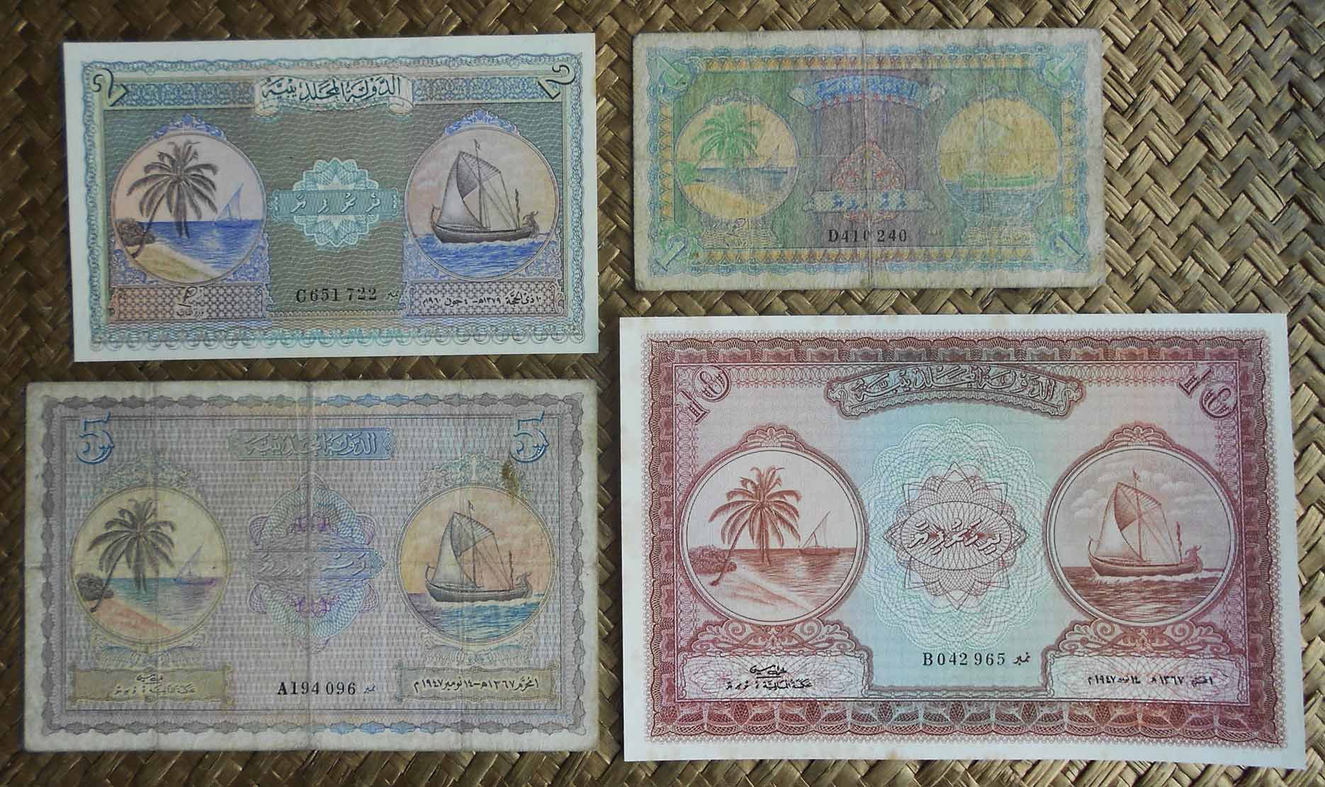 Vamos a contemplar parte de la 1ª serie de billetes que emitió el Banco de Maldivas según Ley 2/66 de 1945, a través de los ejemplares de 1 y 2 rupias de 1960, 5 rupias de 1947 y 10 rupias de 1947. Las ilustraciones de todos ellos fueron obra de Maizan Hassan Manik y Ahmed Abbas, dos artistas maldivos que introdujeron en la isla los métodos modernos de dibujos con plumilla. Fueron impresos por Bradbury Wilkinson and Company de Londres.
