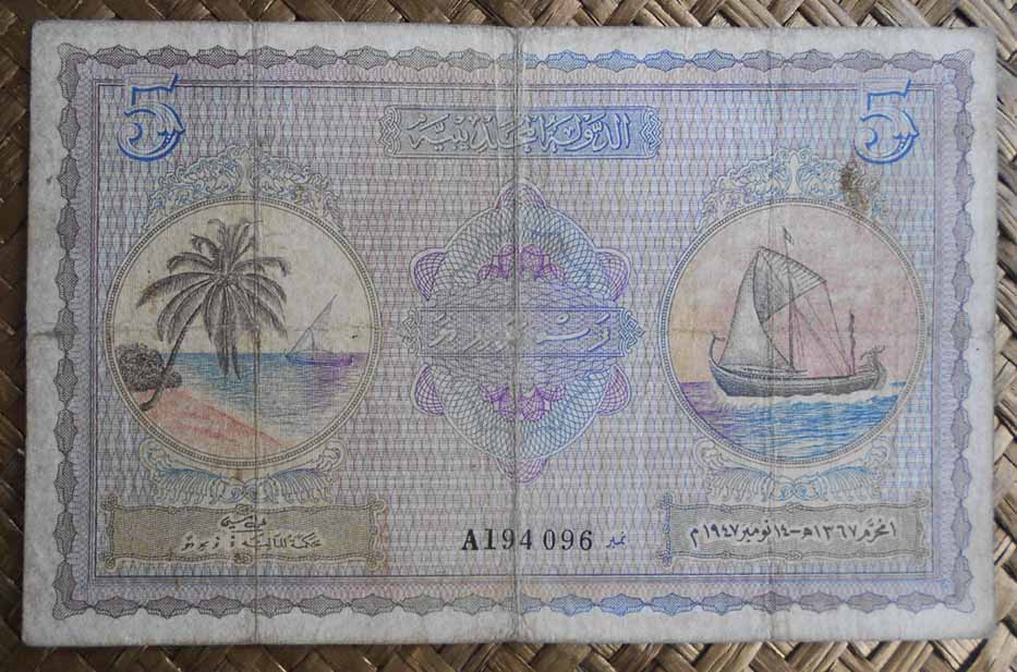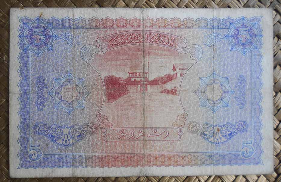 El billete de 5 rupias de Maldivas de 1947 repite medallones en el anverso y ofrece en el reverso la Puerta Sakkarannya, una de las entradas a la Corte de Eterekoilu, el Palacio del Sultán.