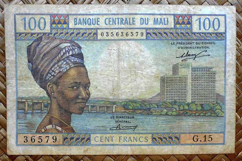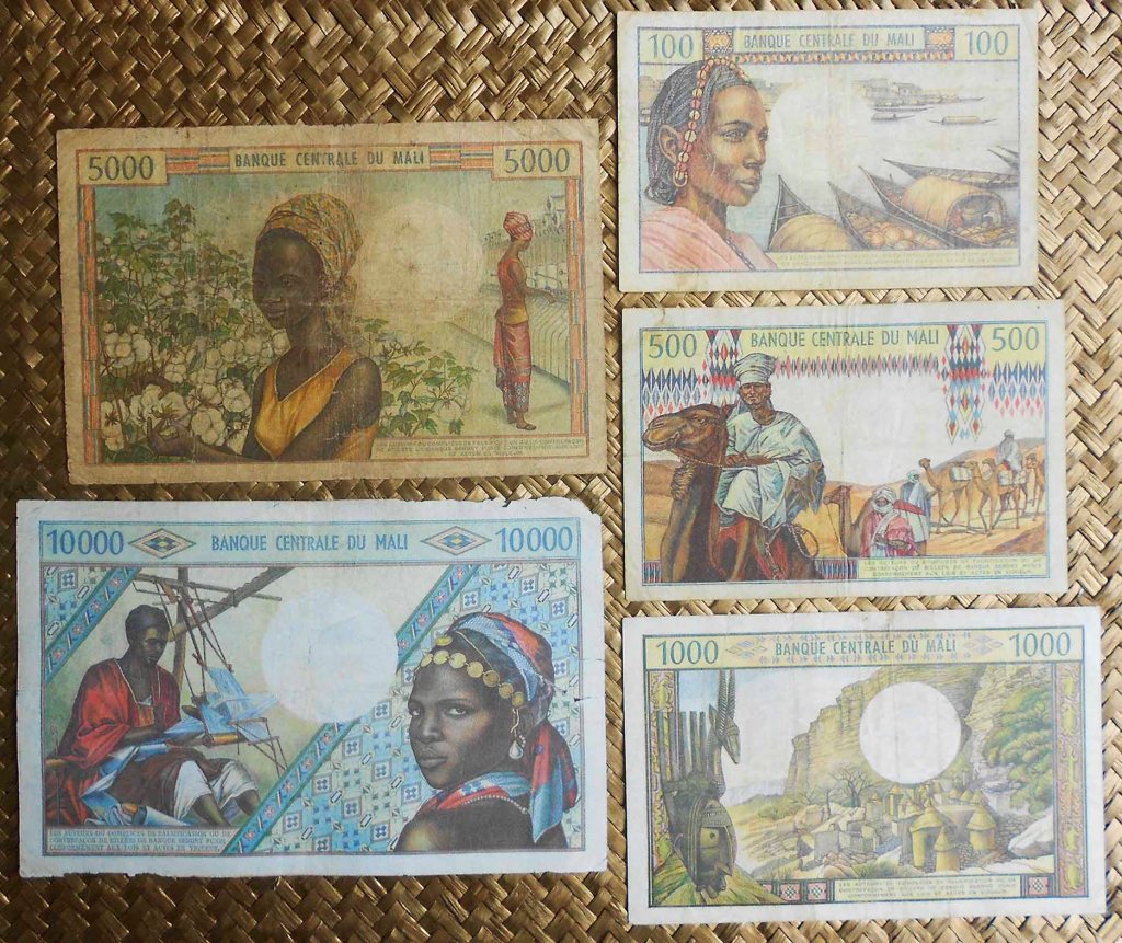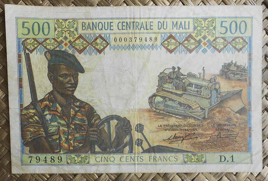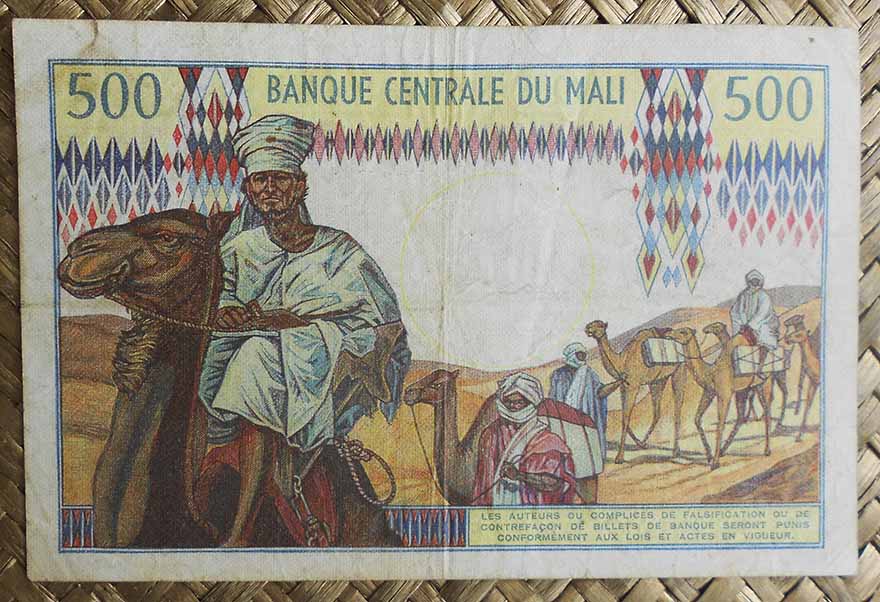 El billete de 500 francos de Mali de 1960 nos ofrece al primer Presidente de la República al anverso. Para el reverso una joven oriunda junto a una tienda bajo toldo que hace de almacén agrícola en primer término y más chozas con tejados de paja alrededor. Su cromaticidad predominante es en tonos rojos.
