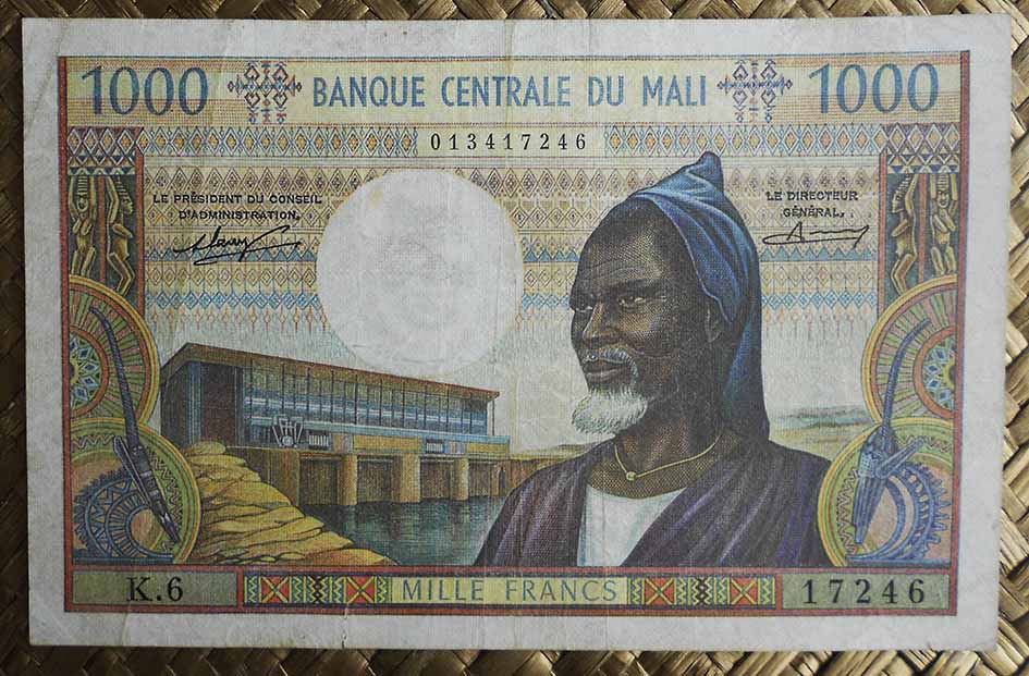 La serie de billetes que revisamos está presidida por Modibo Keïta (1915-1977), quien fuera el primer Presidente de la nueva República independiente entre 1960 y 1968. Maestro en su juventud, muy pronto haría carrera en la política, formando parte de asociaciones anticolonialistas y publicando críticas de oposición al poder de ocupación que le llevaron a la cárcel …apenas unas semanas. Tras ser elegido con 33 años consejero general del Sudán francés y un lustro después consejero de la Unión francesa (entidad administrativa de las colonias francesas de Ultramar), fue alcalde de Bamako (la capital) en 1956.