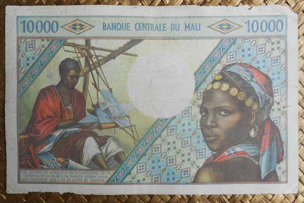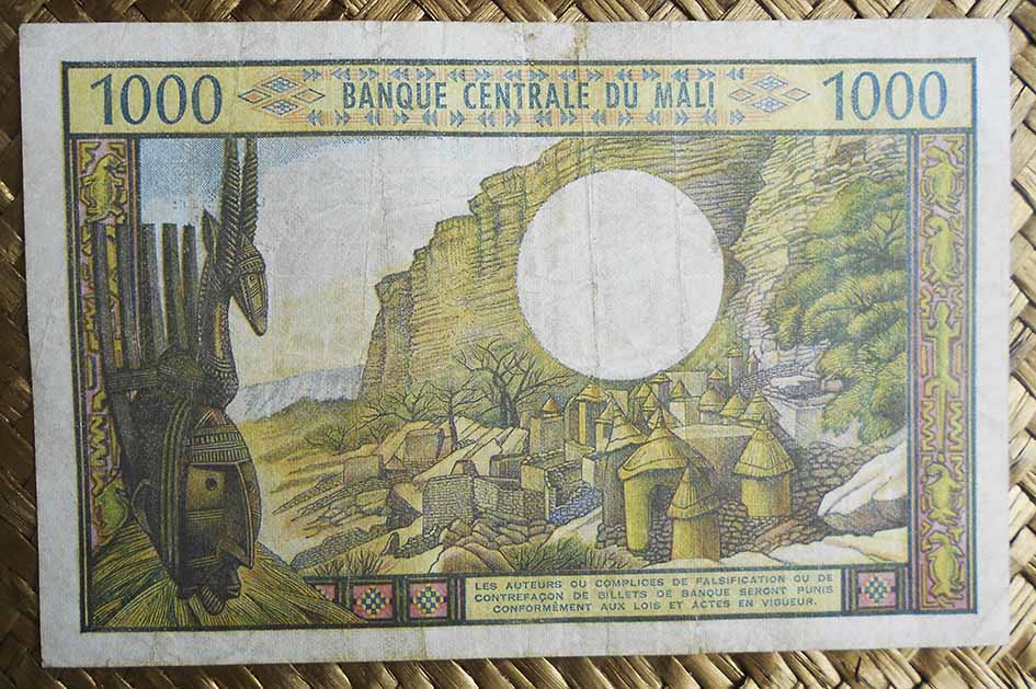 El billete de 1.000 francos de Mali de 1960 nos muestra al Presidente Keïta y yunta de bueyes al anverso. En su reverso un poblado de chozas de adobe con tejado de paja y un campesino oriundo con una rudimentaria azada típica de la etnia dogon.