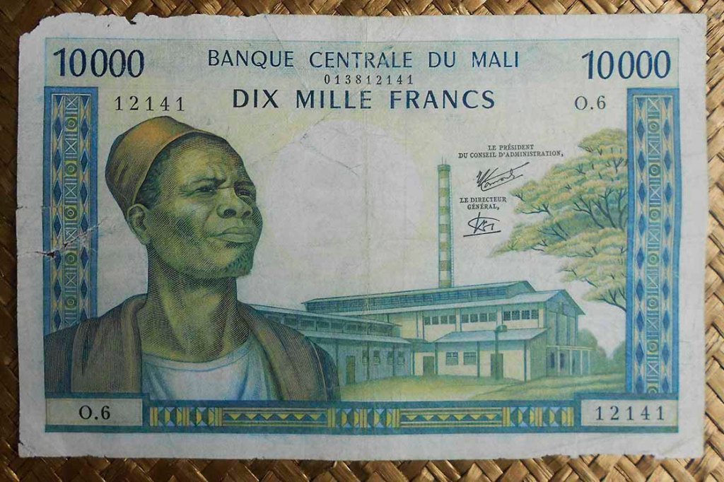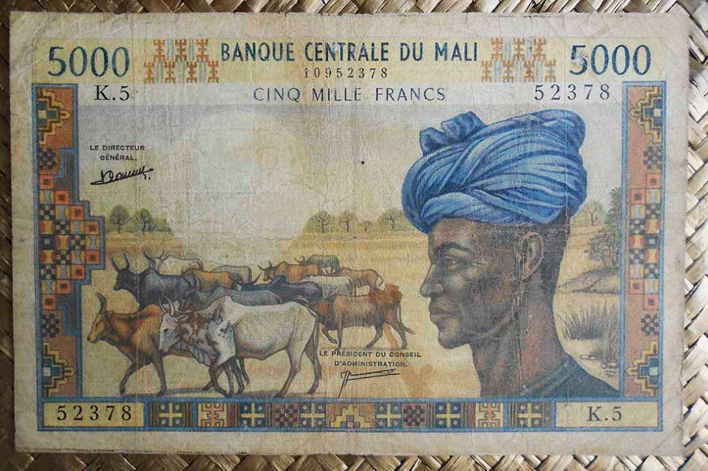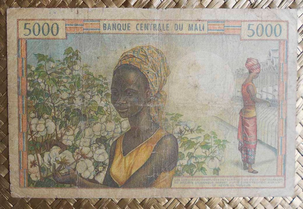 El billete de 5.000 francos de Mali de 1960 nos muestra en el anverso a Modibo Keïta y de fondo una yunta de bueyes con campesinos arando. Para el reverso nos deleitan con una edificación colonial, el “Marché Rose”, mercado neurálgico de Bamako, la capital de Mali. Un incendio en 2014 requirió de su completa reconstrucción; la composición se nos muestra rodeada de puestos de venta y gentío en acciones comerciales. Su cromaticidad predominante es de tonos verdosos.