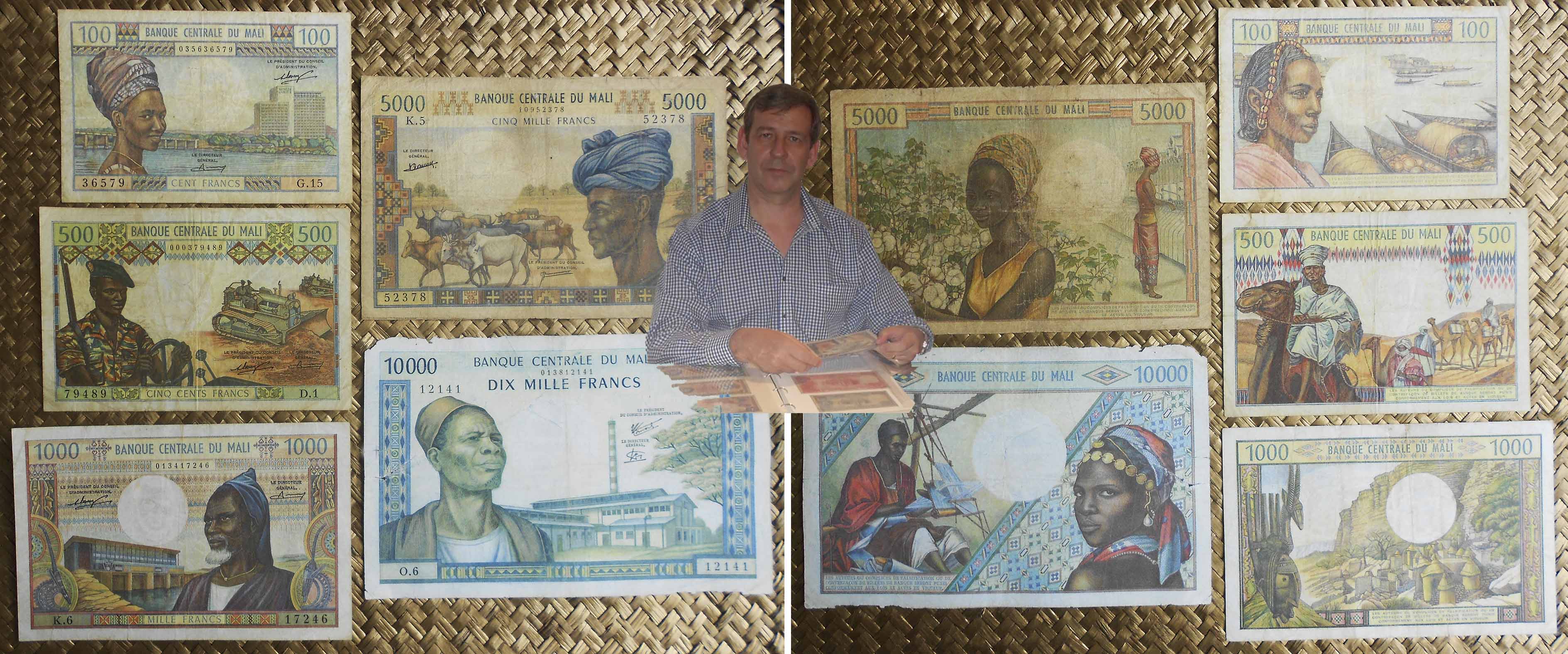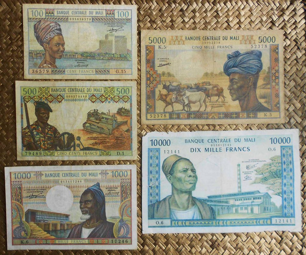 Los ejemplares mostrados son de la 1ª edición de francos del nuevo “Banque de la République du Mali”. Fueron impresos por la empresa checoslovaca Státní Tiskárna Cenin (STCP) de Praga. La fecha impresa en su anverso (22 de septiembre de 1960) coincide con la de la Independencia, aunque su puesta en circulación sería posterior, en 1962. A la imagen de Keïta le acompaña en los anversos dos campesinos arando con una yunta de bueyes en los valores más altos. Llevan las firmas de Attaher Maiga como Ministre des Finances y de Lamine Sow como Governeur de la Banque. Sus textos en francés y los números de serie en tipografía roja.
