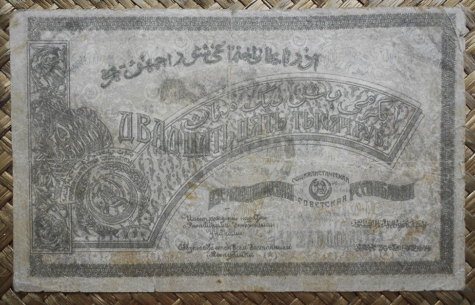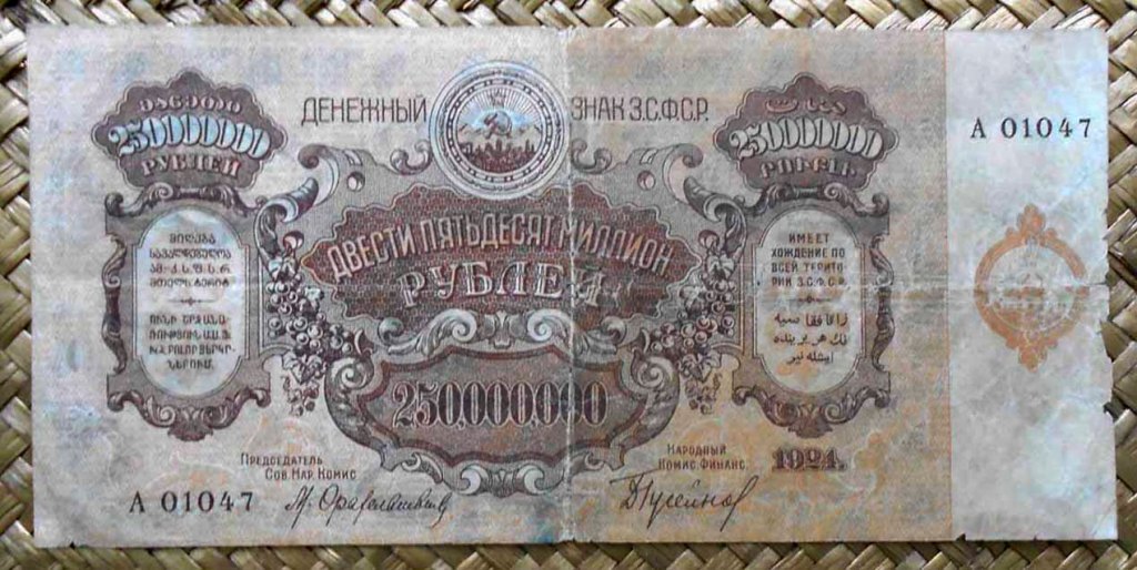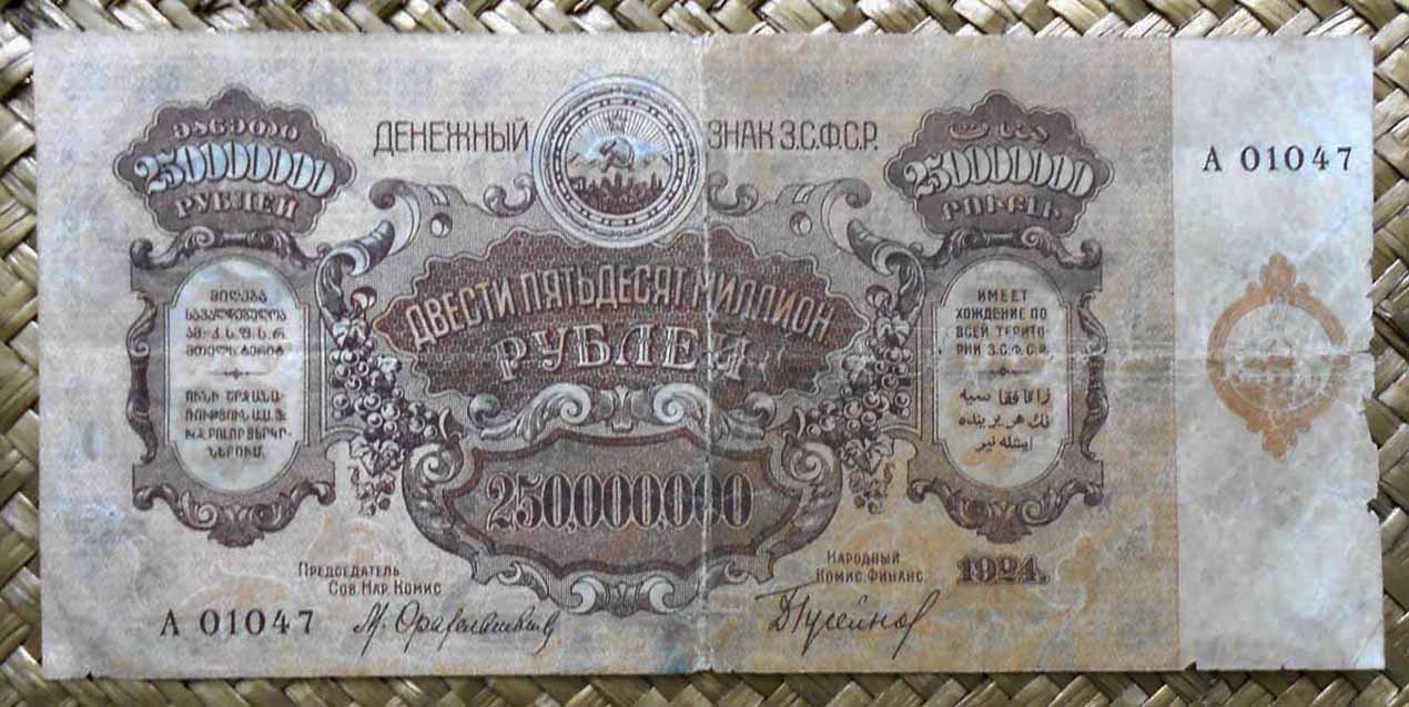 Claro ejemplo de la hiperinflación reinante en la época continuaron con sus emisiones pero cambiando de formato. Para el anecdotario notafílico completamos el billetario transcaucásico con las últimas emisiones de 1924 pero en formato, llamémosle, “imperial”, rescatando el típico billete zarista de formato rectangular, más bien estrecho y con su zona derecha en blanco, solo para la filigrana o marca de agua y algún medallón pequeño.