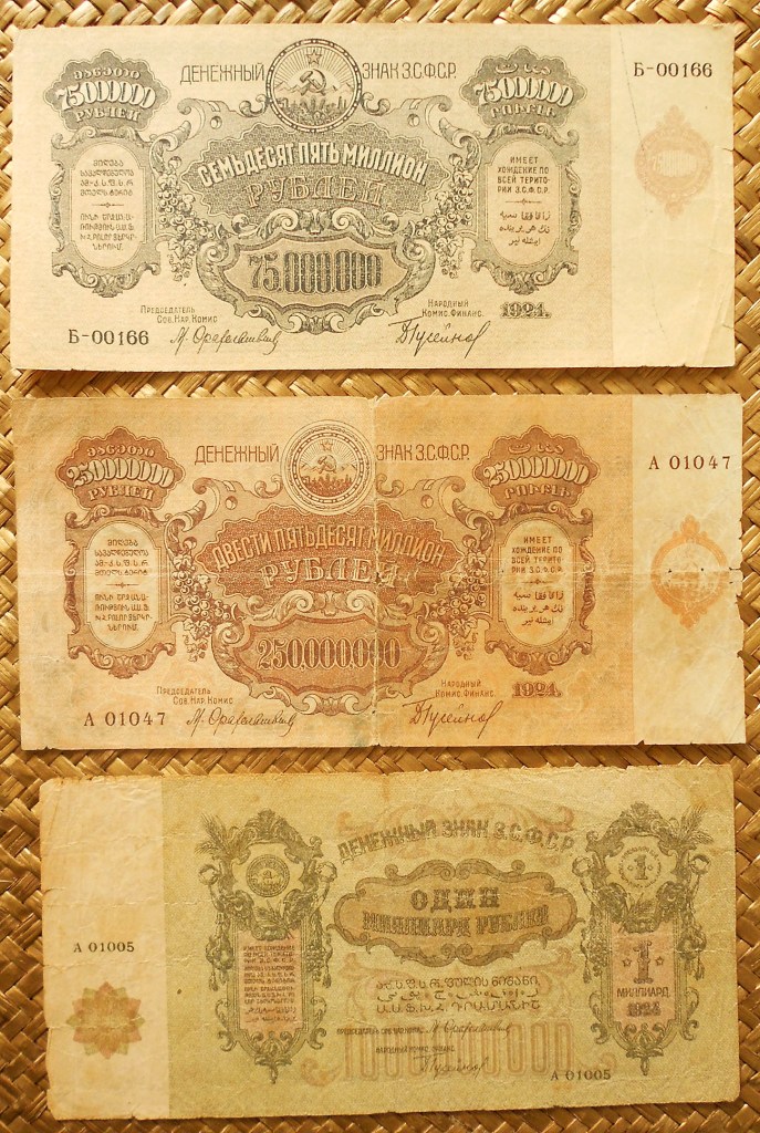 Contemplemos el billete de 75.000.000 rublos de 1924, el billete de 250.000.000 rublos de 1924 y el billete de 1.000.000.000 rublos de 1924. La sobriedad en el diseño de sus predecesores de 1923 se rompe con el estilo de esta nueva edición, que rescata la profusión de orlas, marcos, rosetas, cartuchos y composiciones de corte imperial pero eliminando la ostentación, lógico para servir en un territorio del proletariado.