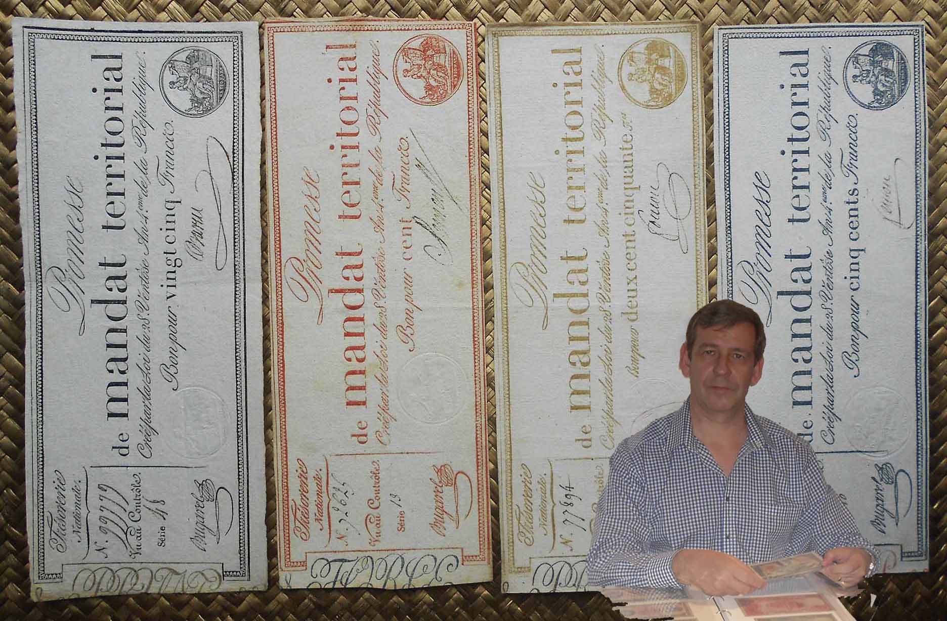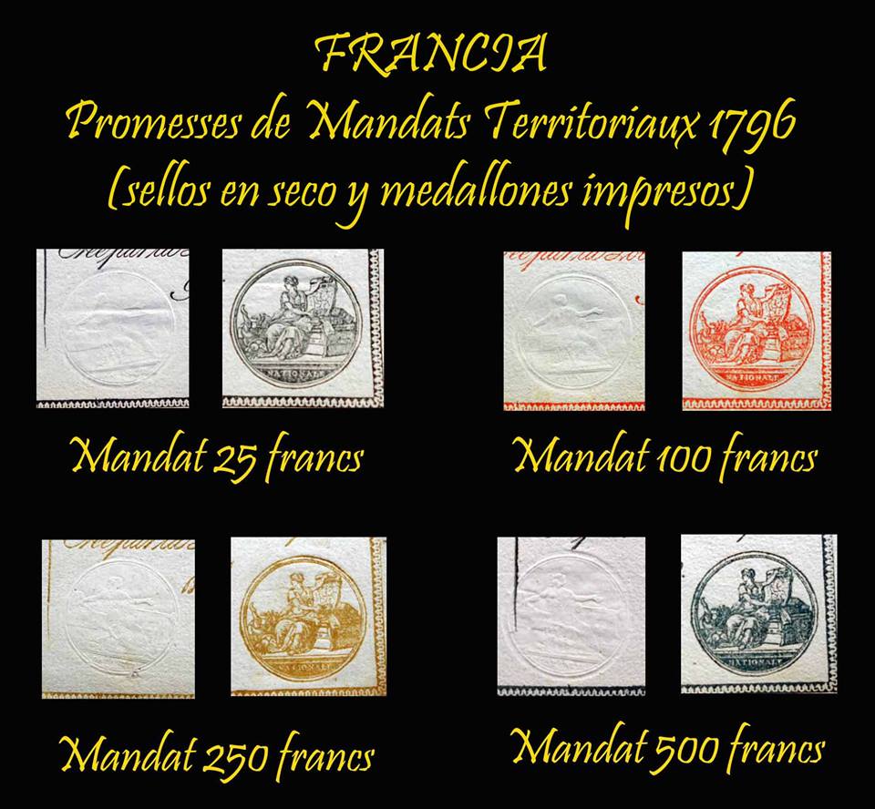 Contemplaremos los “Promesses de Mandats Territoriaux” de 25, 100, 250 y 500 francos de 1796.