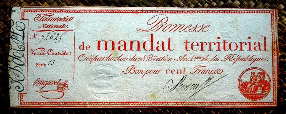 Fueron desmonetizados en febrero de 1797 (para seguir su calendario republicano, el “16 pluviose An 5eme de la République”). El “Banque de France” sería creado en enero de 1800, y los “assignants” y “mandats” serían destruidos simbólicamente en la plaza Vendôme en esa fecha.