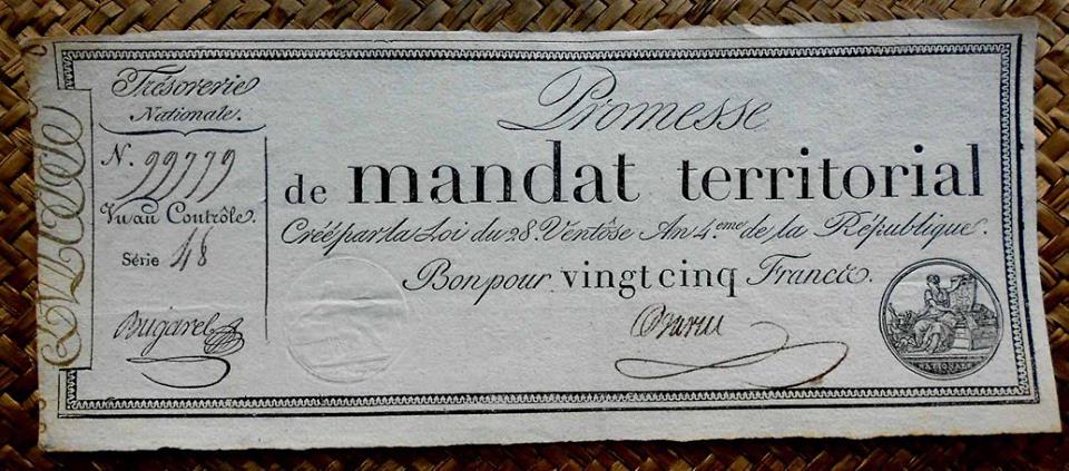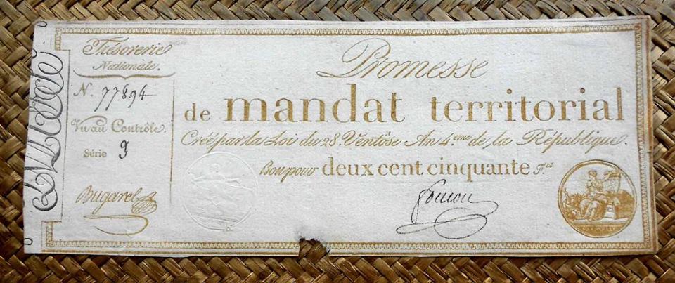 Emitida en marzo de 1796 tras la desmonetización de los “Assignants” (por Decreto de 19 de febrero de 1796) solo se mantuvo como papel fiduciario hasta febrero de 1797. En ellos apreciaremos una eliminación total de referencias a la monarquía (que sí se mantuvieron en algunos “assignants” anteriores, con sellos reales)
