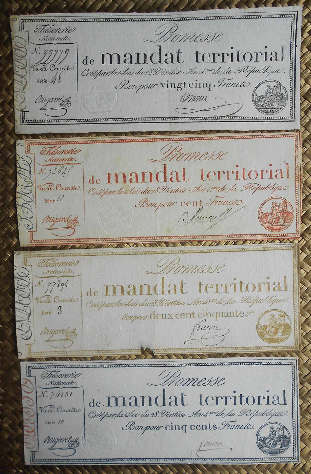 Contemplaremos los “Promesses de Mandats Territoriaux” de 25, 100, 250 y 500 francos de 1796.