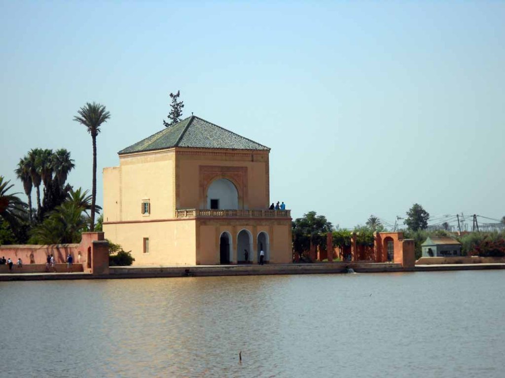 En el s. XII se excavó en el centro de los jardines de La Menara una gran alberca que almacenaría agua para los sultanes almohades. En el s. XIX se alzó junto a ella un pabellón de cubierta piramidal y tejas verdes, que sería utilizado por los sultanes en sus encuentros amorosos. Dice la leyenda que todas las mañanas el sultán tiraba a la alberca a la concubina con la que había pasado la noche. El piso inferior ofrece un pórtico de tres arcos hacia el estanque y el piso superior incorpora un balcón con balaustrada hacia el mismo lado. Desde su ubicación se pueden contemplar los extensos jardines de olivos y árboles frutales con los picos de la cordillera del Atlas como fondo.