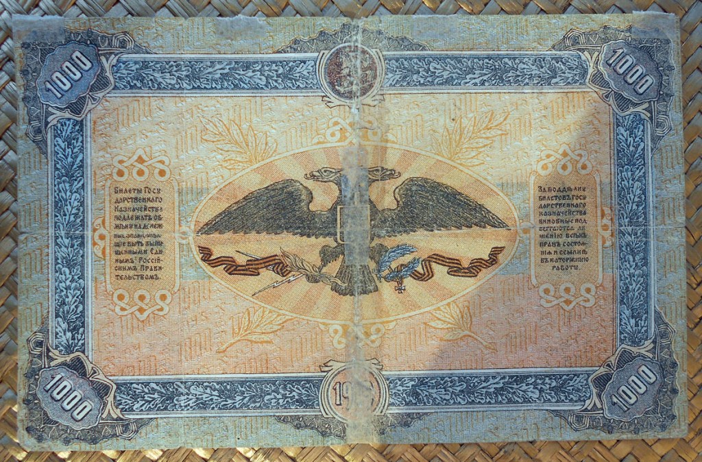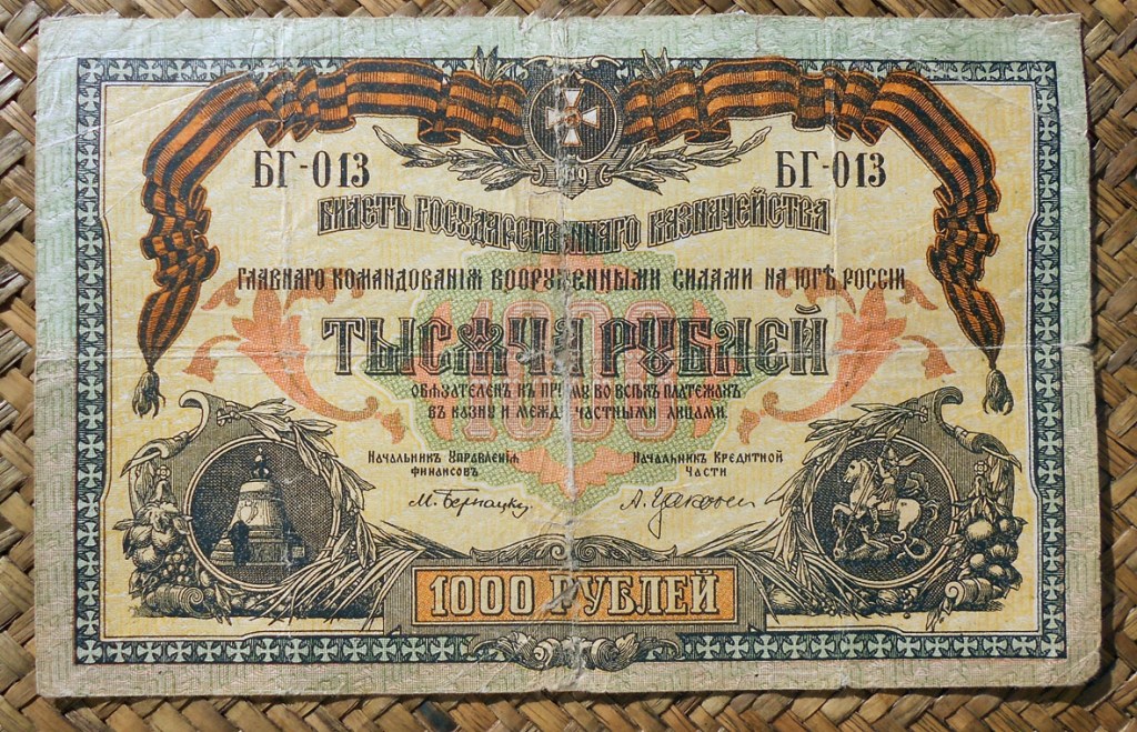 El billete ruso de 1000 rublos de 1919, perteneciente a la serie de South Russia –Rostov durante el gobierno del General Wrangel, nos muestra dos rosetones laterales, el de la derecha con la imagen de San Jorge combatiendo al dragón y el de la izquierda con la Campana Zarina sobre su pedestal.