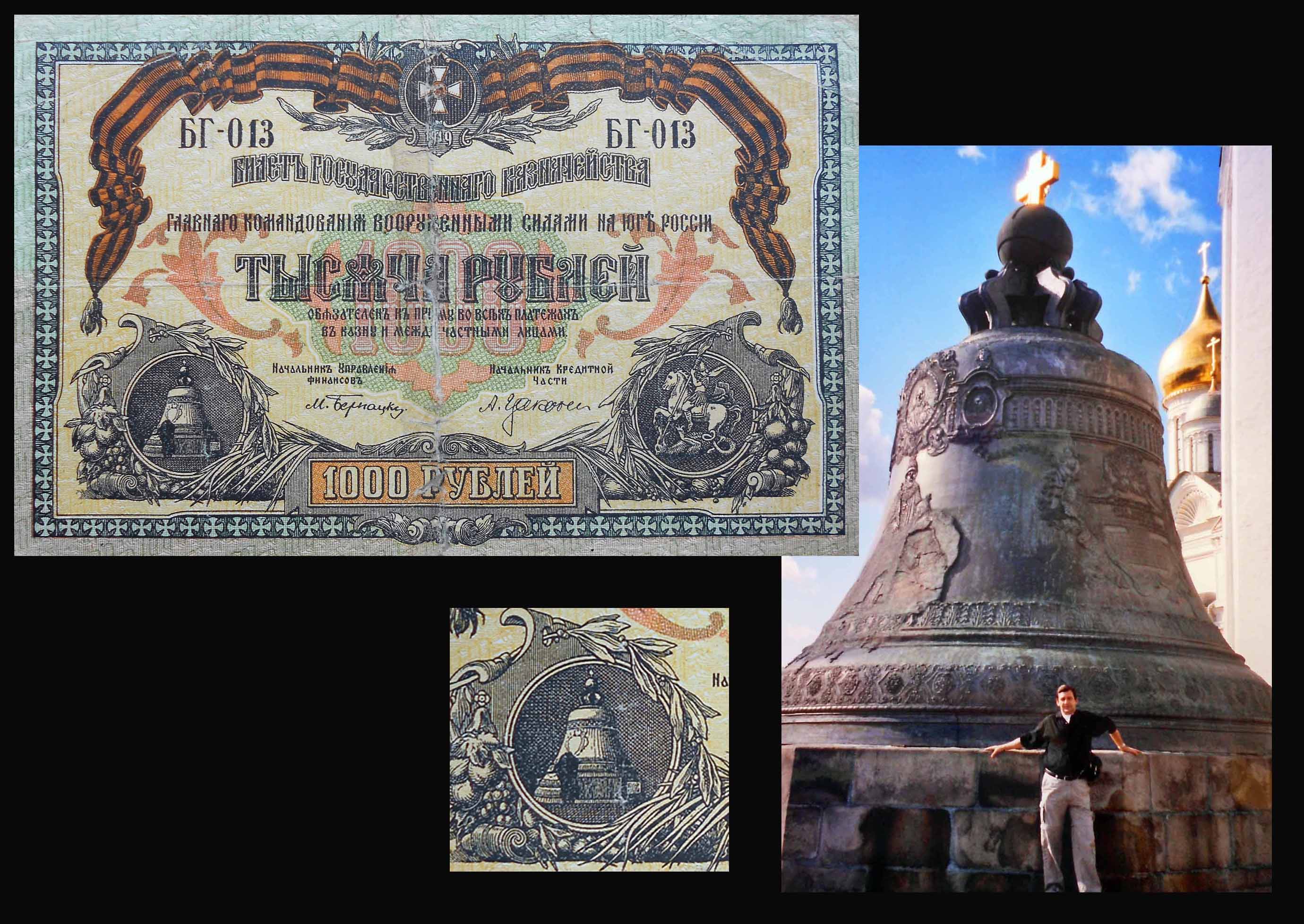 El billete ruso de 1000 rublos de 1919, perteneciente a la serie de South Russia –Rostov durante el gobierno del General Wrangel, nos muestra dos rosetones laterales, el de la derecha con la imagen de San Jorge combatiendo al dragón y el de la izquierda con la Campana Zarina sobre su pedestal.