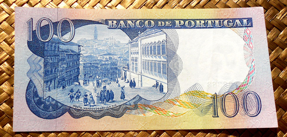 El billete de Portugal de 100 escudos de 1964 nos ofrece en su reverso un grabado con la panorámica del Oporto del siglo XIX vista desde la torre de los Clérigos, con la rua dos Clérigos en todo su recorrido. Se aprecia en su línea la Iglesia de San Ildefonso y al fondo las torres de la Catedral o Sé.