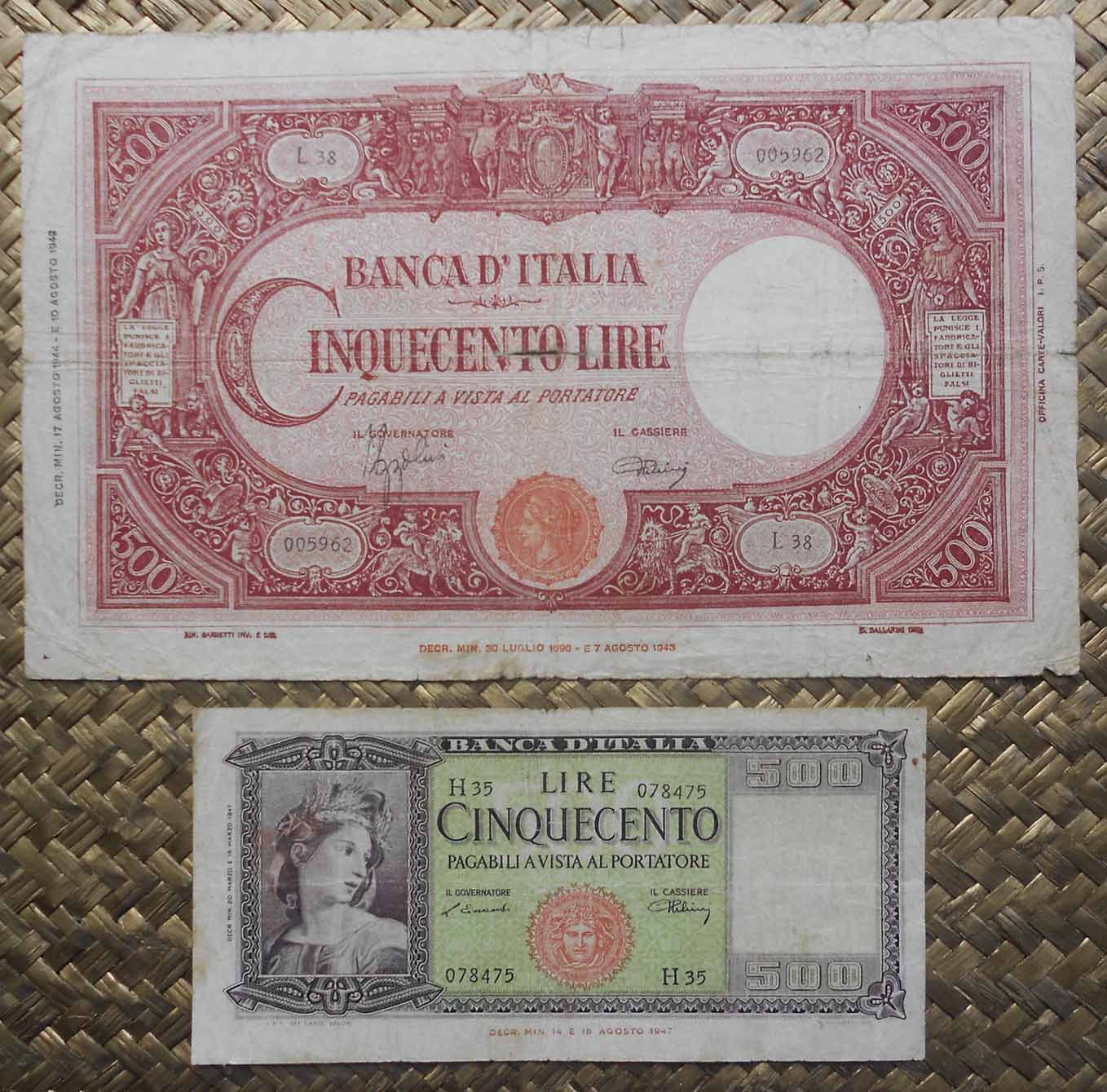 Desde “Semejanzas” volvemos a Italia. La comparativa notafílica esta vez nos traslada hasta los primeros ejemplares emitidos por la República de Italia nada más salir derrotada de la 2ª Guerra Mundial. Contemplaremos los billetes de 500 liras de las emisiones de 1947 y de 1948, conocidas como series “Italia Ornata di Spighe”. De la primera emisión (1947) revisaremos dos ejemplares con tonalidades cromáticas distintas.