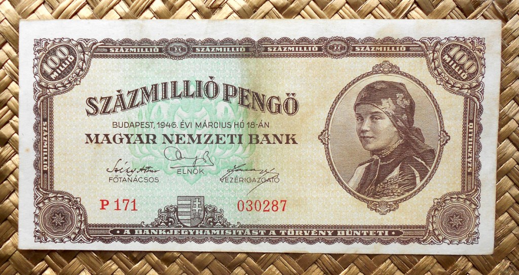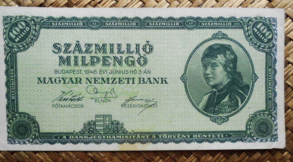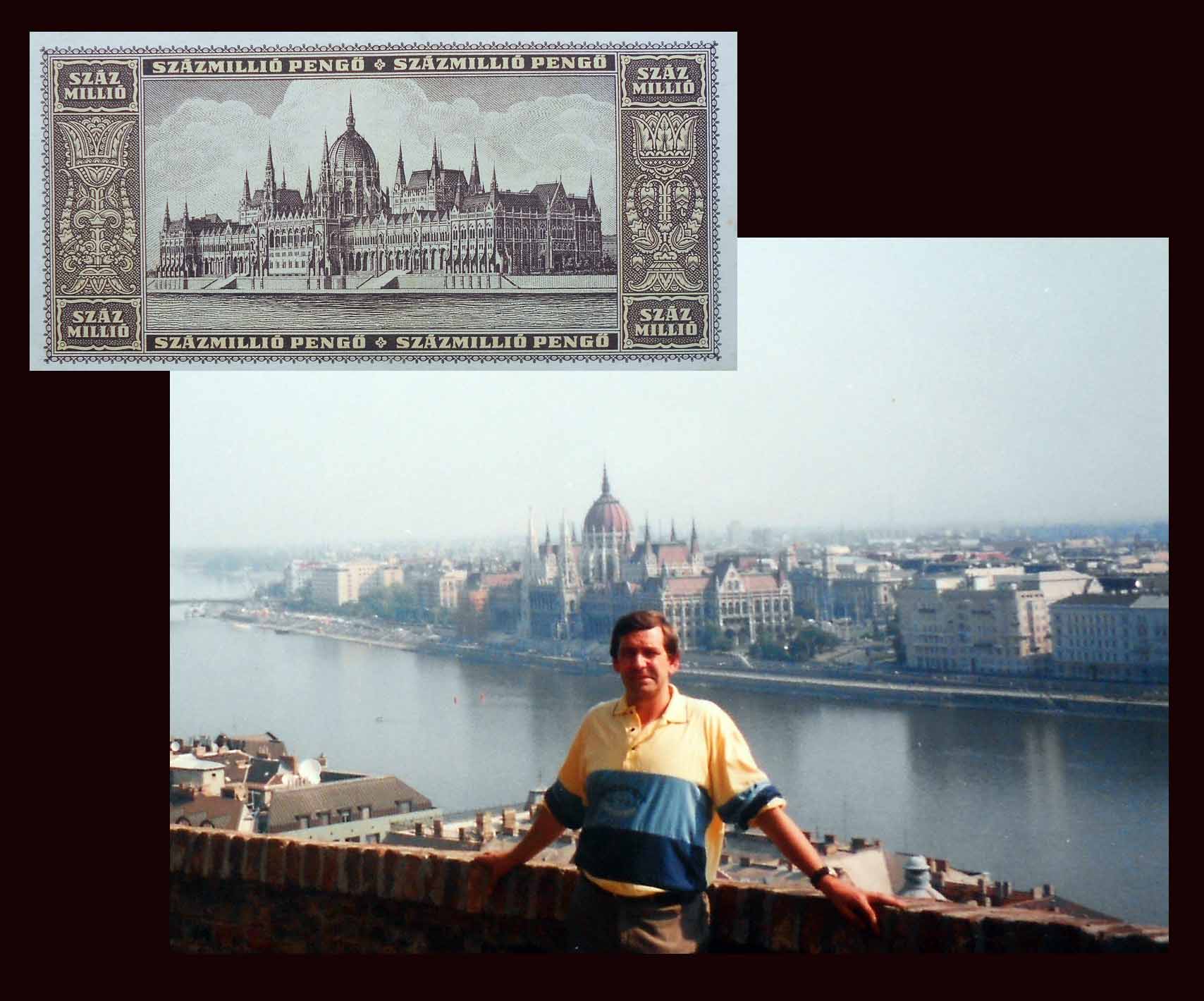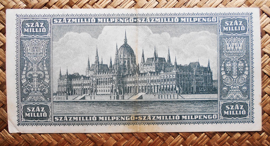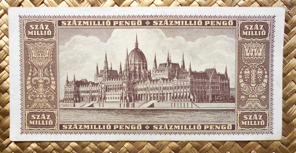 También el billete de 100.000.000 milpengos de Hungría de 1946, emitido apenas tres meses más tarde que el anterior con una nueva denominación de moneda, el milpengo, sigue mostrándonos la preciosa vista aérea del Palacio Imperial a orillas del Danubio.