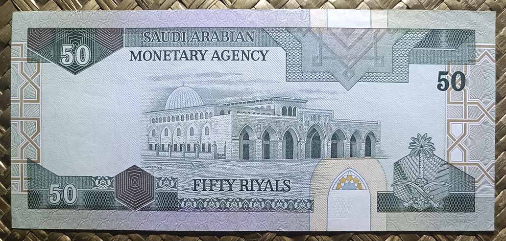 Arabia Saudí desde 1983 en todas sus emisiones de billetes de 50 riyals decidió ofrecer una colorida vista de la Cúpula de la Roca. Os muestro la primera edición, el ejemplar de 50 riyals de Arabia Saudí de 1983 donde la muestra en su anverso, acompañada del retrato del rey Fahd bin Abdulaziz Al Saud. En su reverso comparte una vista de la Mezquita al-Aqsa, construcción vecina que comparte la explanada Monte del Templo. Fue editado por la imprenta inglesa De la Rue de Londres.
