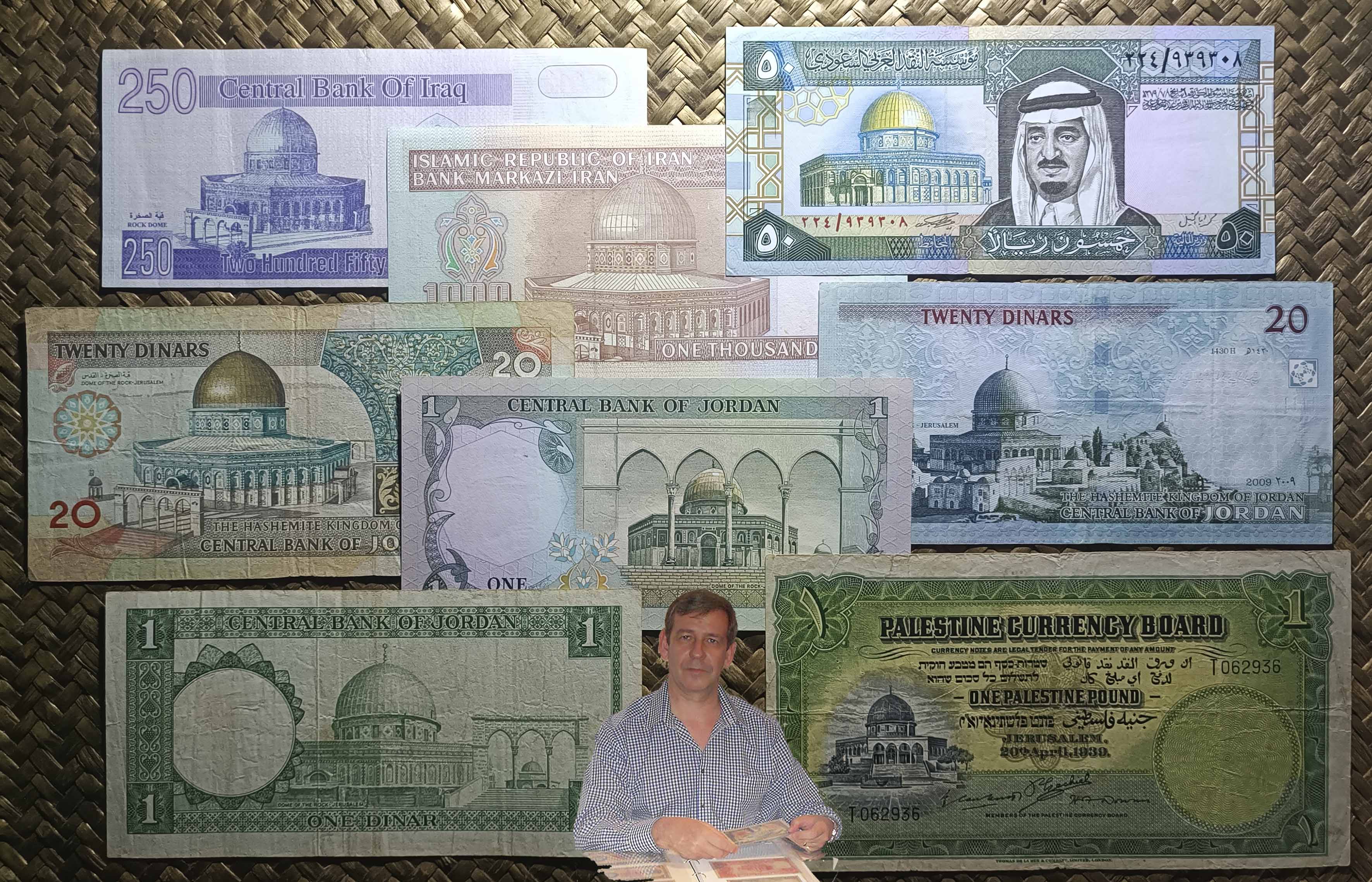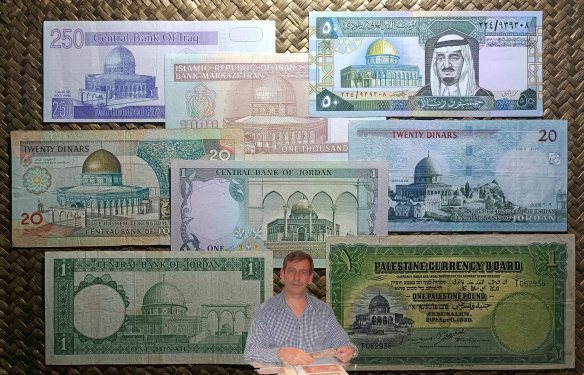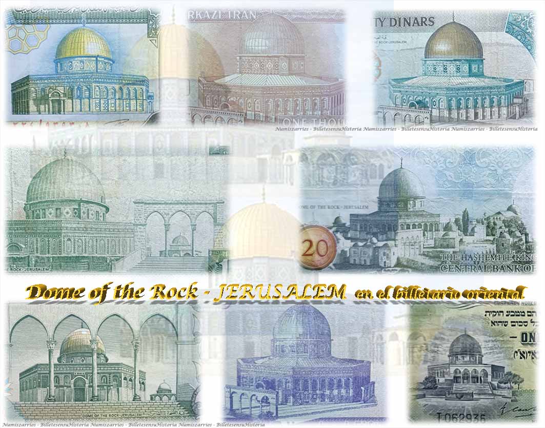 Revisaremos ejemplares de Palestina británica, Arabia Saudí, Irak, Jordania o Irán, donde sus emisores grabaron en distintas ediciones imágenes de la Cúpula de la Roca de Jerusalem. Libras palestinas, dinares iraquíes, riyals árabes, rials iraníes o dinares jordanos compartieron en diferentes fechas esta emblemática edificación.