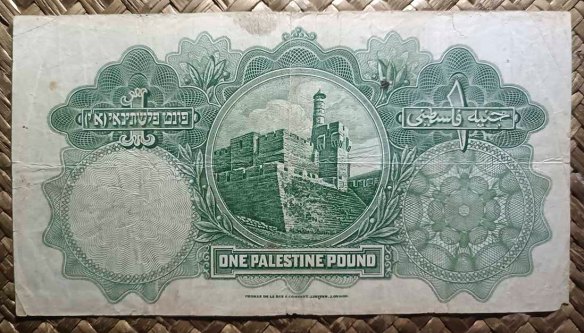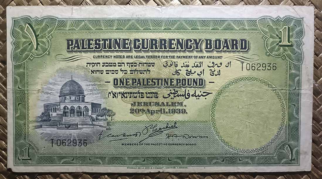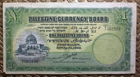 El billete de Palestina británica de 1 libra de 1939 nos ofrece en su anverso un medallón con la vista alzada de la Cúpula de la Roca, junto a leyendas en hebreo, árabe e inglés. Este territorio estuvo bajo el Mandato Británico entre 1921 y 1948. Para el reverso nos ofrece una vista aérea de la Torre de David en Jerusalem. Fue editado por la imprenta inglesa Thomas de la Rue & Company de Londres.