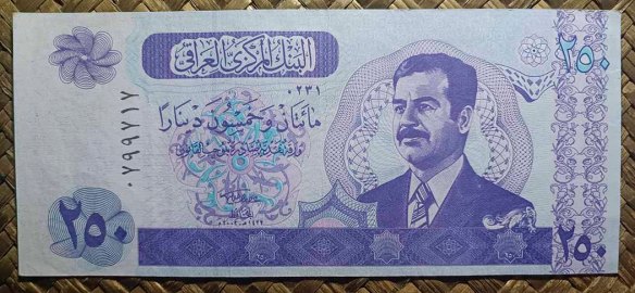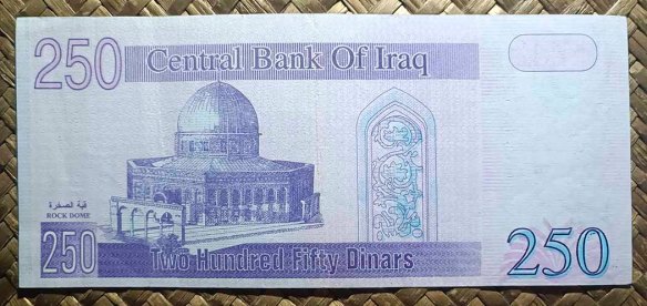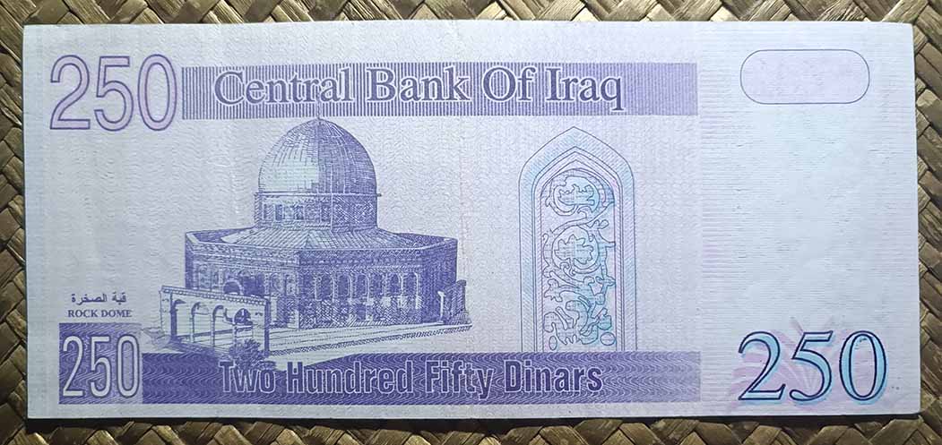 El billete de Irak de 250 dinares de 2002 nos ofrece en su anverso una imagen monocolor violeta de la Cúpula de la Roca, dejando para el anverso el retrato de Saddam Hussein, quien fuese presidente del país entre 1979 y 2003.