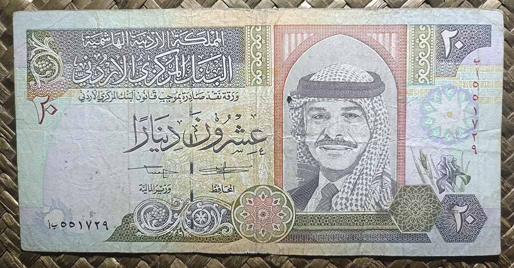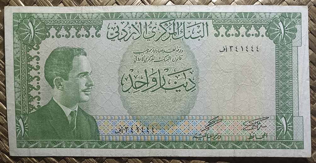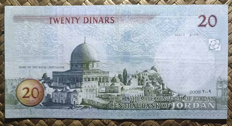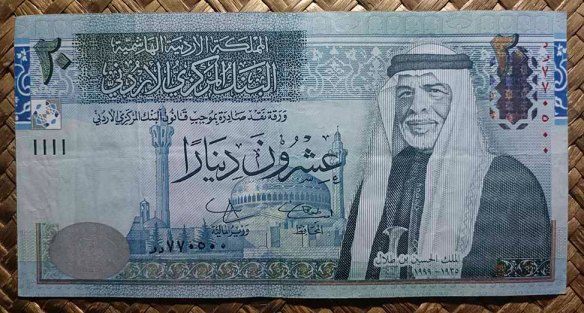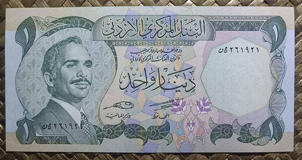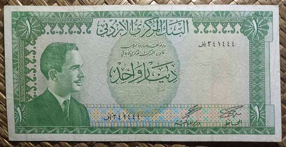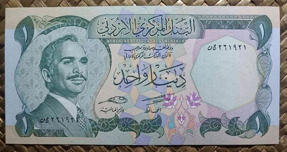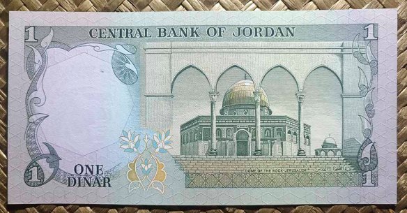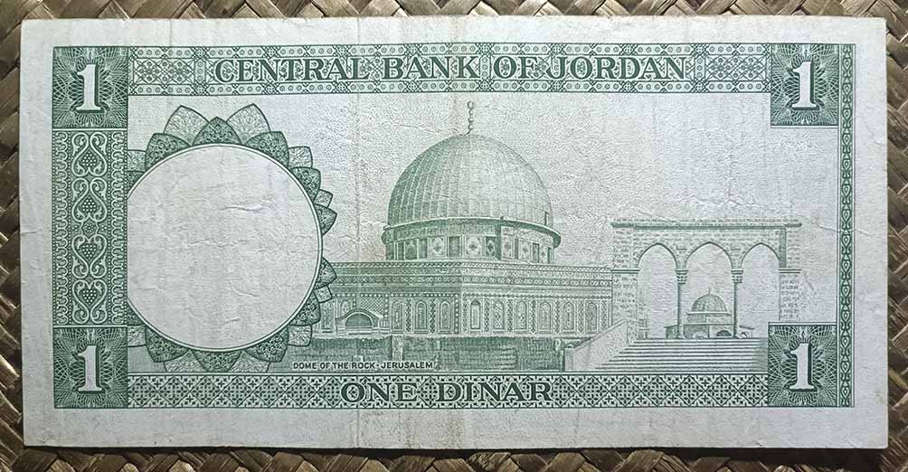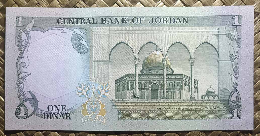 El reino de Jordania, ya en su emisión de 1959 nos ofreció la Cúpula de la Roca como grabado principal de su billete de 1 dinar, donde su vista alzada aparecía en en reverso en impresión monocromo de tonos verdes. Para su anverso, en culto al personaje, nos mostraban el retrato del rey Hussein bin Talal, “Hussein I de Jordania”.