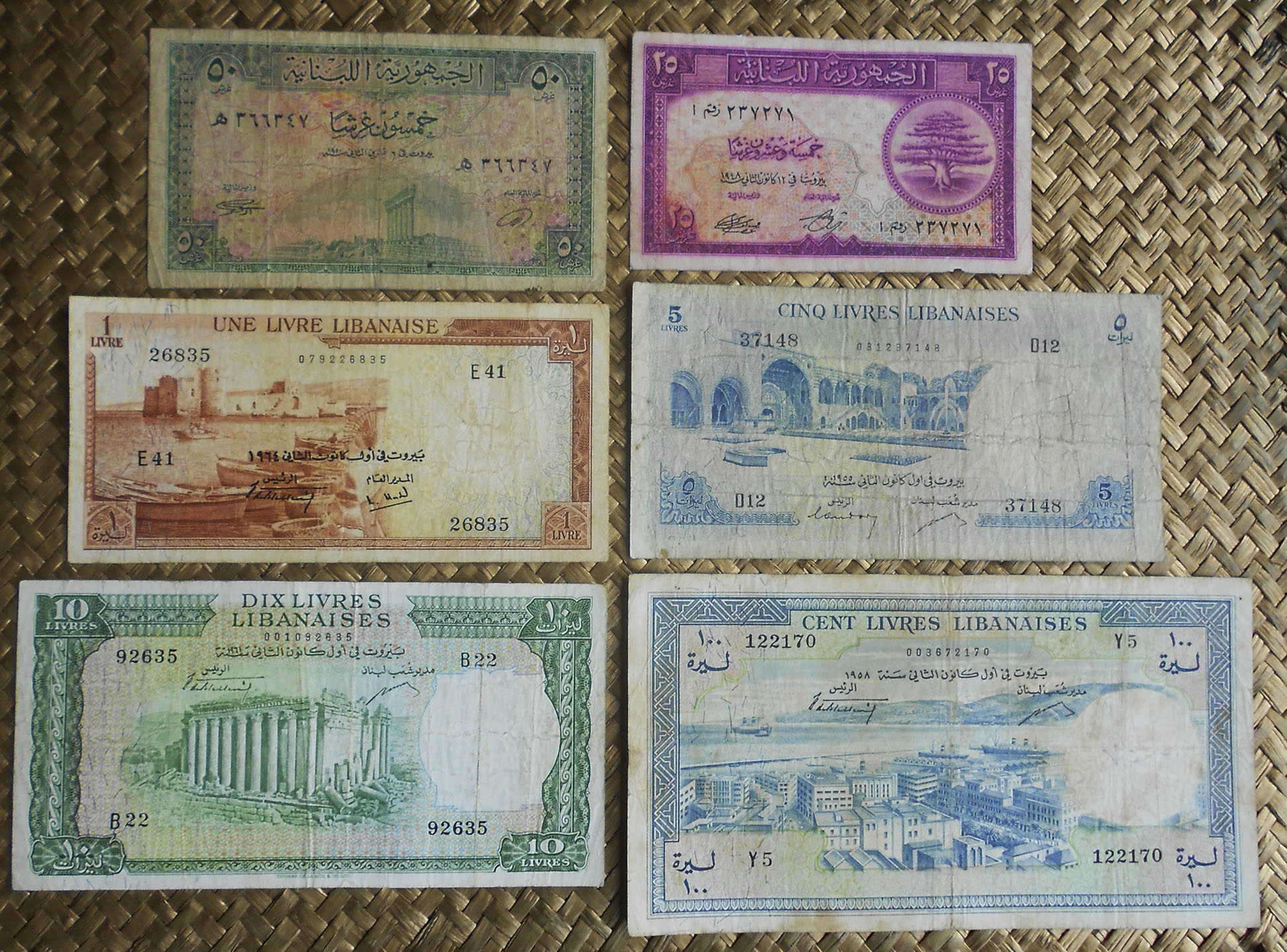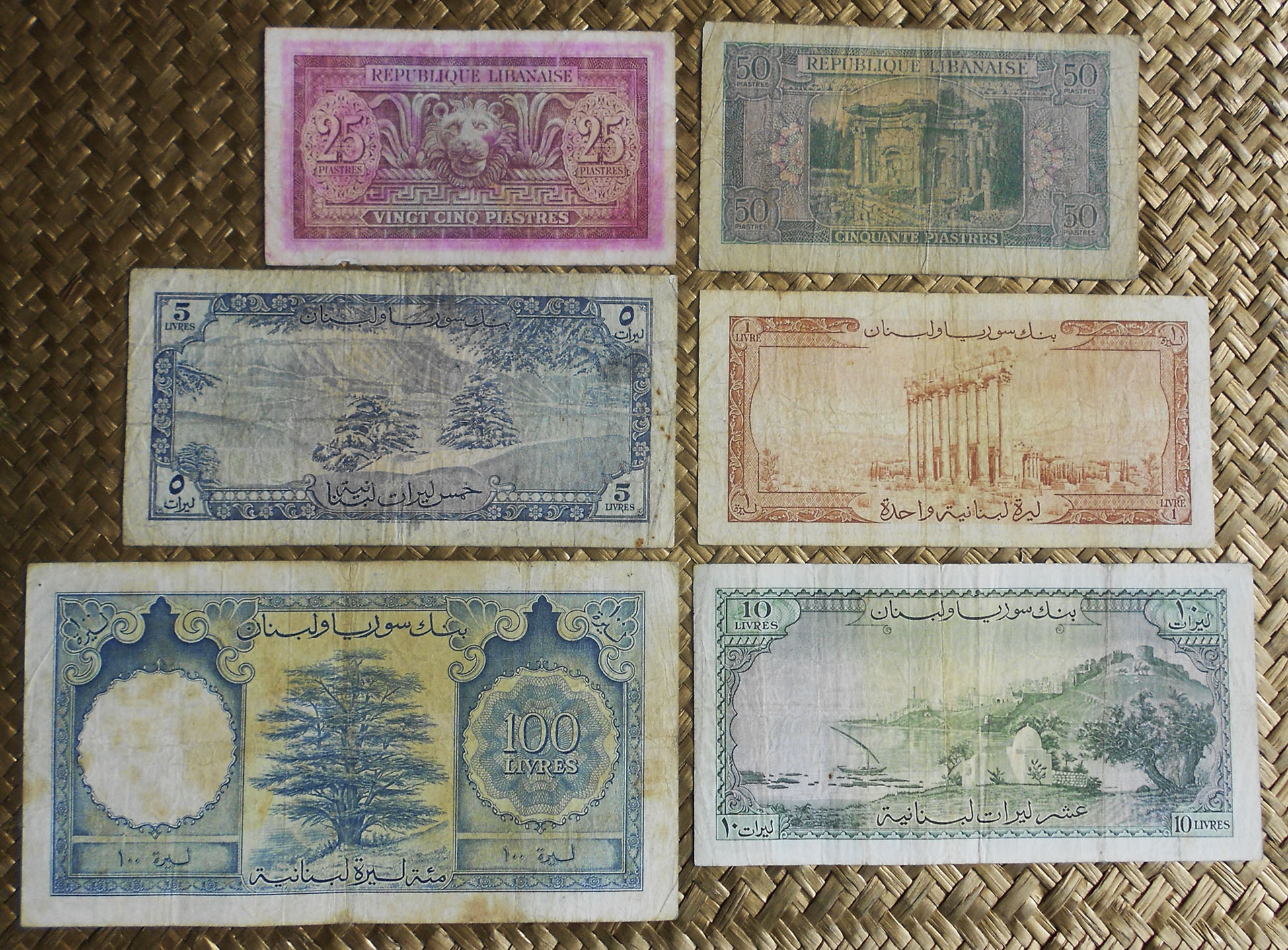 Revisamos los billetes de 20 francos de Djibouti de 1928-38 en coloración lila amarronada y en coloración azulada, el ejemplar de 20 francos de Nueva Caledonia de 1929 y el billete de 5 piastras de Indochina de 1926. Todos ellos nos ofrecen en su anverso la alegoría de una joven dama coronada con una diadema de espigas, hojas y frutos, en clara alusión a la mitológica Ceres (o Deméter), diosa de la Agricultura, la Cosecha y la Fecundidad. Todo ello en un artístico marco con hojas y palmas, Bajo un diseño de los artistas franceses Clement Serveau / Emile Deloche (anverso) y Rita Dreyfuss / Roche (reverso), con textos en francés y números de serie en tipografía negra, combinan coloraciones predominantes según el destino de sus emisiones.