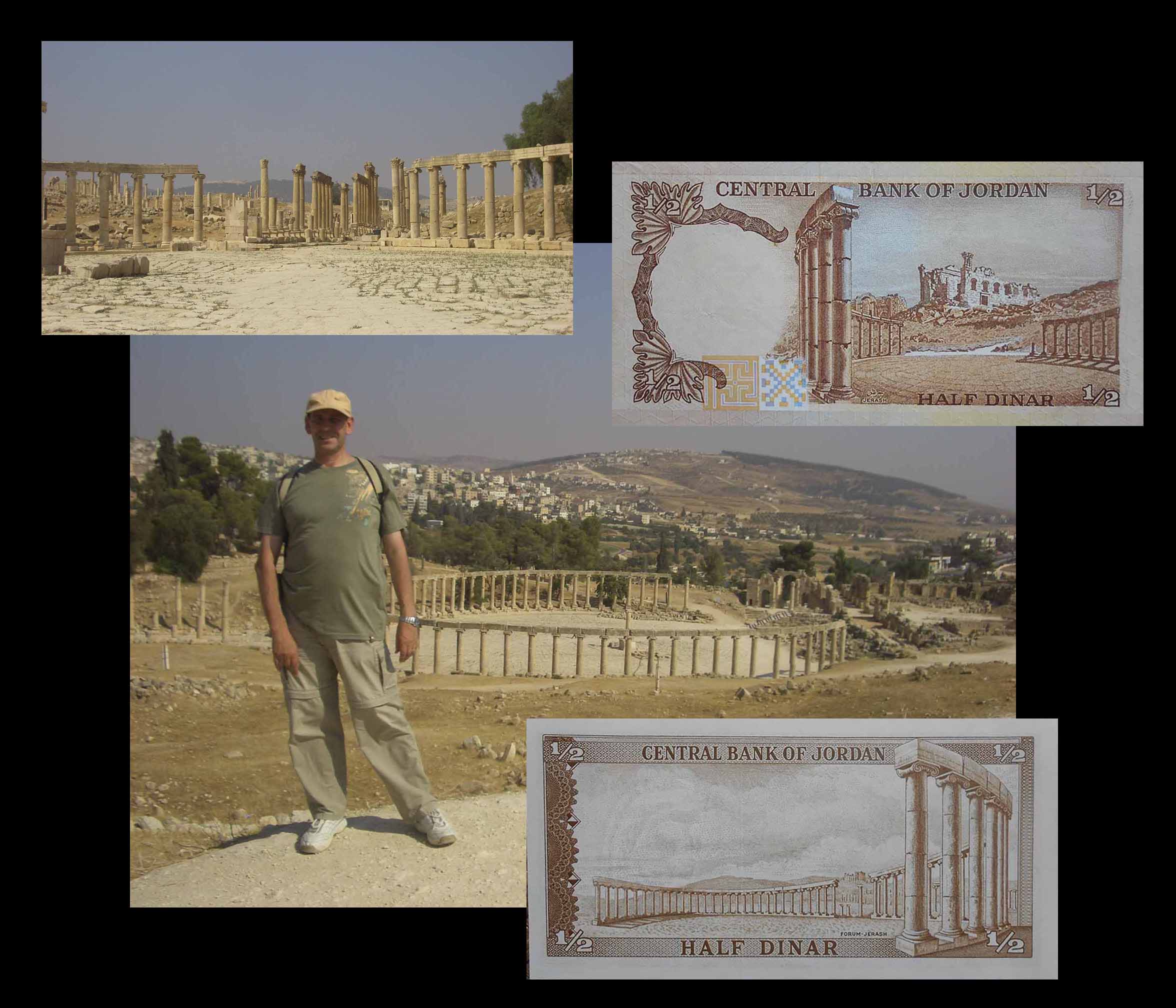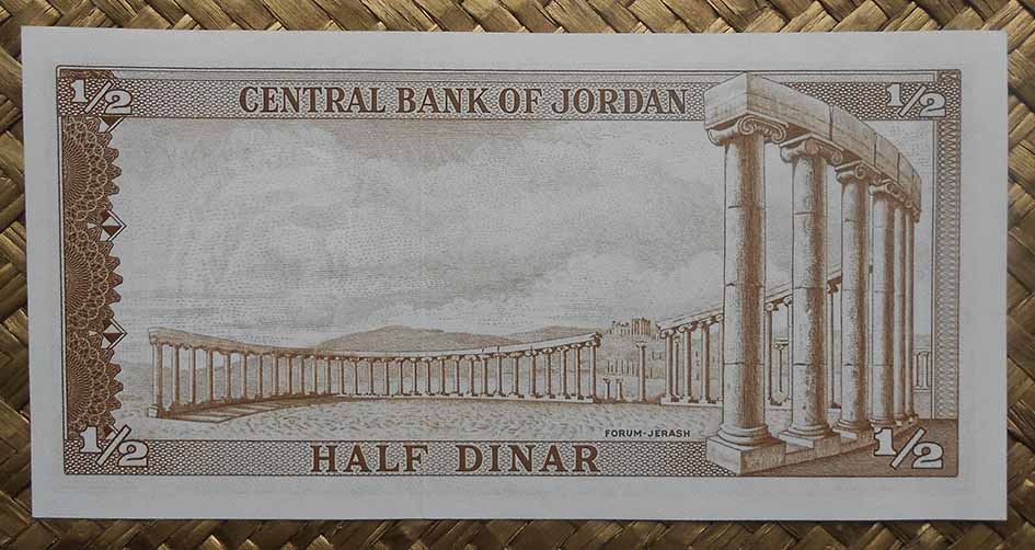 El billete de ½ dinar de las emisiones 1975-92 nos ofrece en su reverso otra vista del foro de la plaza Oval con el Templo de Zeus elevándose al fondo de la imagen. En esta perspectiva se ve con claridad en enlosado concéntrico de la plaza. En su anverso, el rey Hussein I en un retrato más veterano que los anteriores.