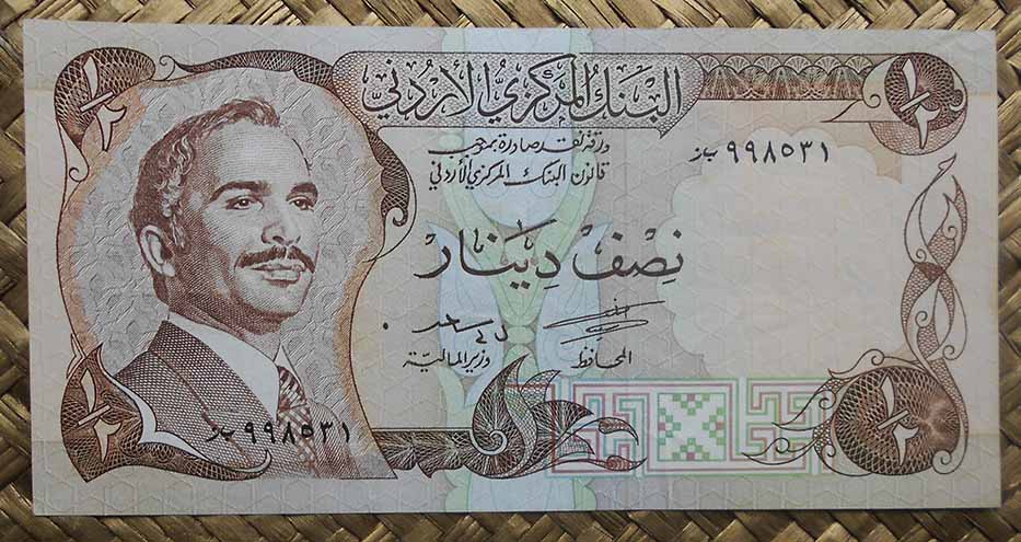 El billete de ½ dinar de 1973 es fiel reflejo del anterior, mostrando los mismos grabados y coloraciones. Únicamente actualiza la divisa del billete, pasando de fils (centésimos de dírham) a dinares.