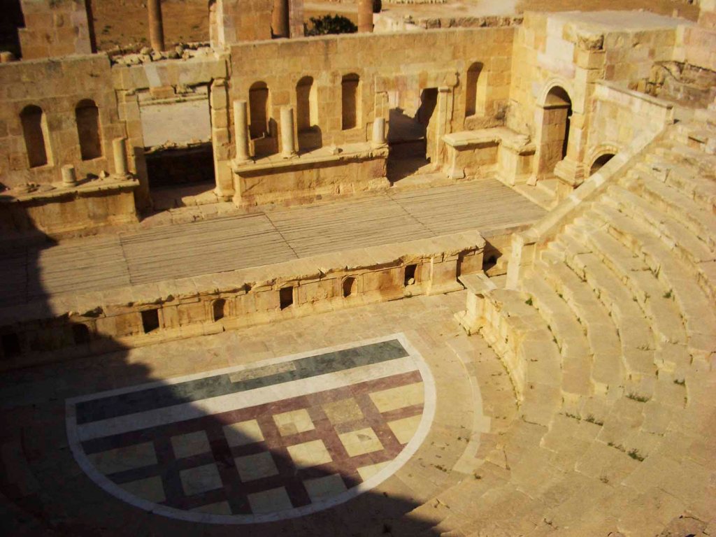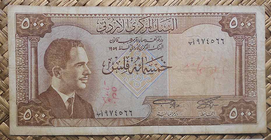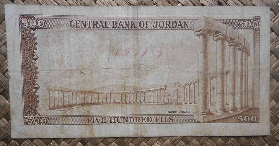 El billete de 500 fils de 1965 nos muestra en su reverso el foro o plaza Oval de Jerash, rodeado de 56 columnas de cuatro cuerpos de piedra, capiteles jónicos y dinteles curvos uniéndolas rodeando la plaza.