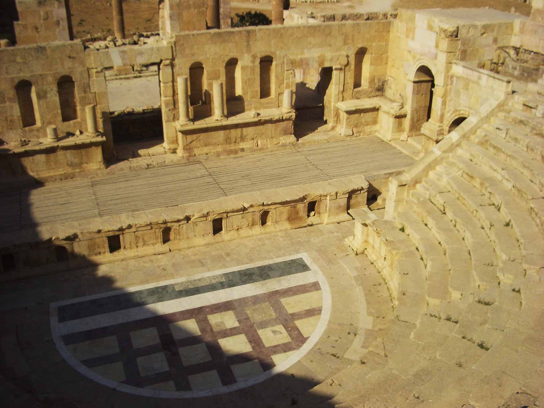 Su pavimento, extraordinariamente bien conservado, está formado por losas de piedra caliza, grandes en el exterior y más pequeñas según se acerca al centro de la elipse, dando una sensación de profundidad elogiable. Hablamos de una construcción del siglo I.