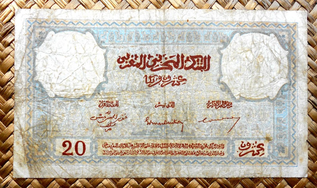 El anverso del billete de 20 francos de Marruecos colonial de 1945 nos muestra en su centro la imagen de la Torre Hassan rodeada de arbolado, como único grabado reconocible del billete, ya que el resto de su diseño es un laberinto de arabescos y rosetas, en una composición monocromática poco habitual en su billetario.