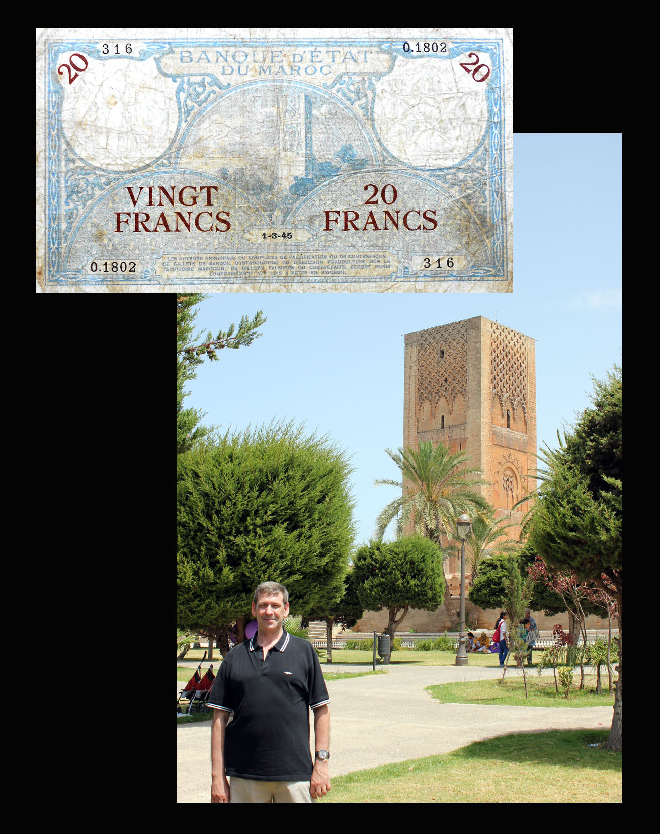 El anverso del billete de 20 francos de Marruecos colonial de 1945 nos muestra en su centro la imagen de la Torre Hassan rodeada de arbolado, como único grabado reconocible del billete, ya que el resto de su diseño es un laberinto de arabescos y rosetas, en una composición monocromática poco habitual en su billetario.
