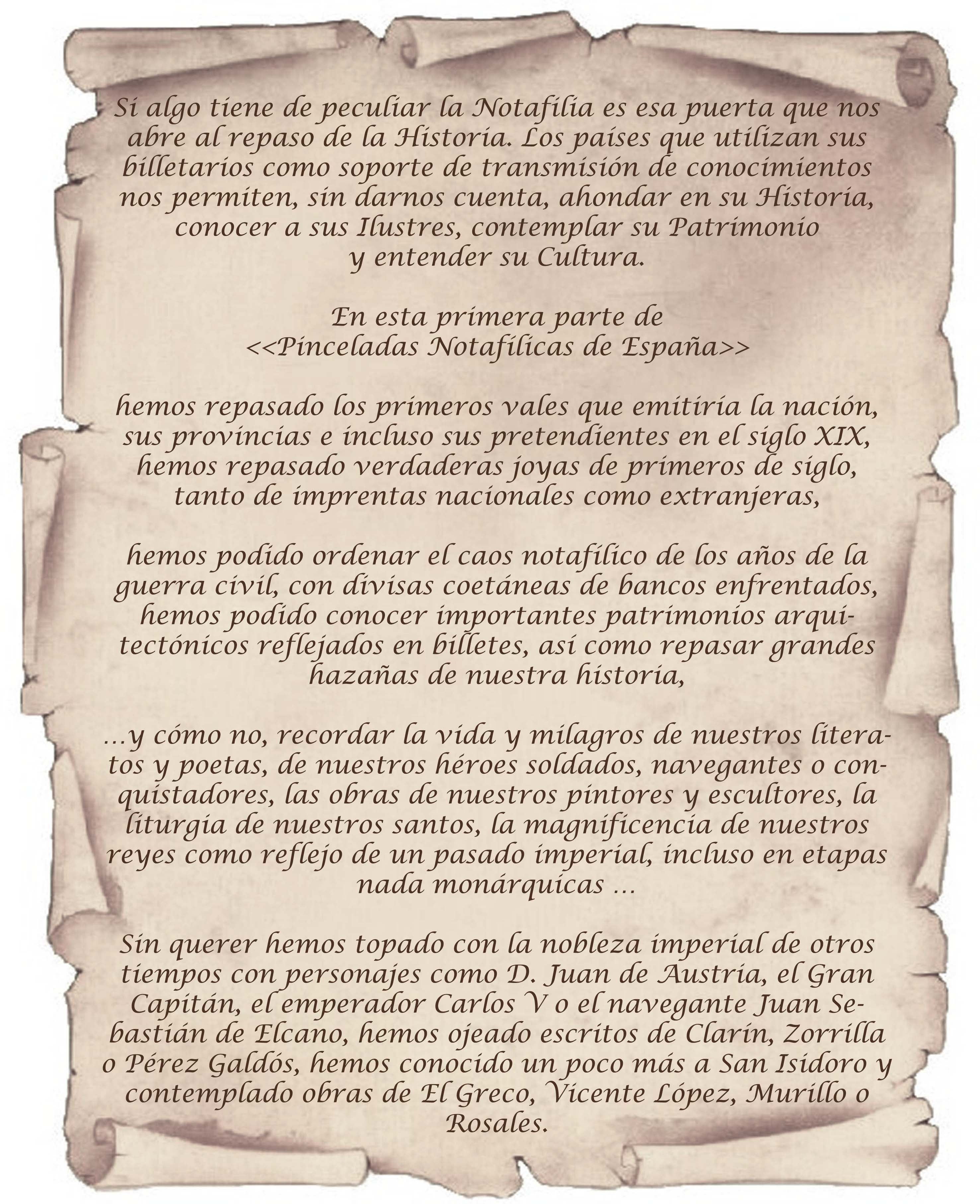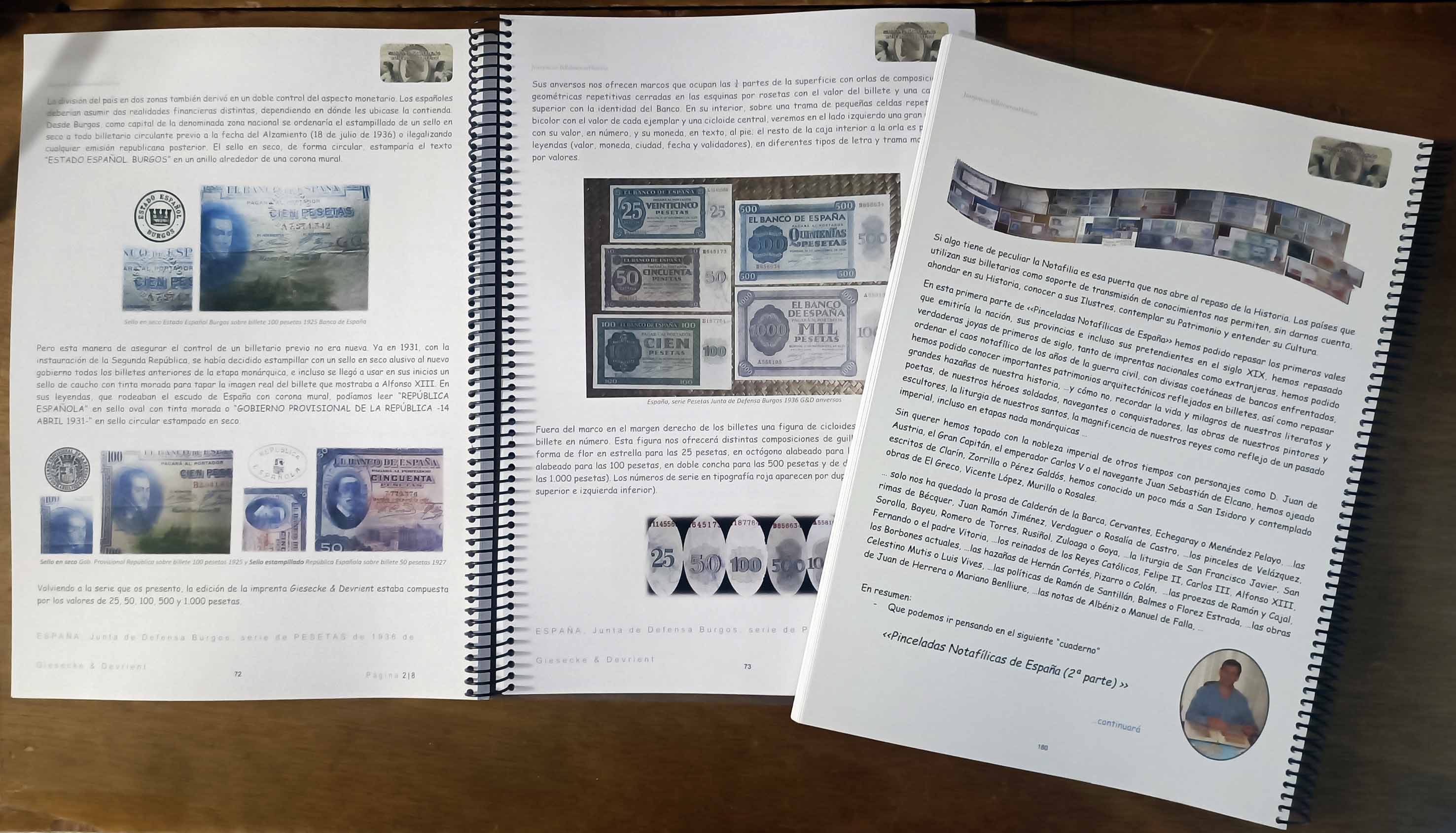 <Pinceladas Notafílicas del Billetario Español -1ª> ha recogido a través de 31.000 palabras, 400 fotos y 180 páginas a color un sosegado trabajo de investigación, recopilación y contraste con ejemplares de colección. Se acompaña de fotografías e ilustraciones gráficas, que nos ayudan a solapar historia, arte, patrimonio, cultura y hechos plasmados en nuestros billetes de banco.
