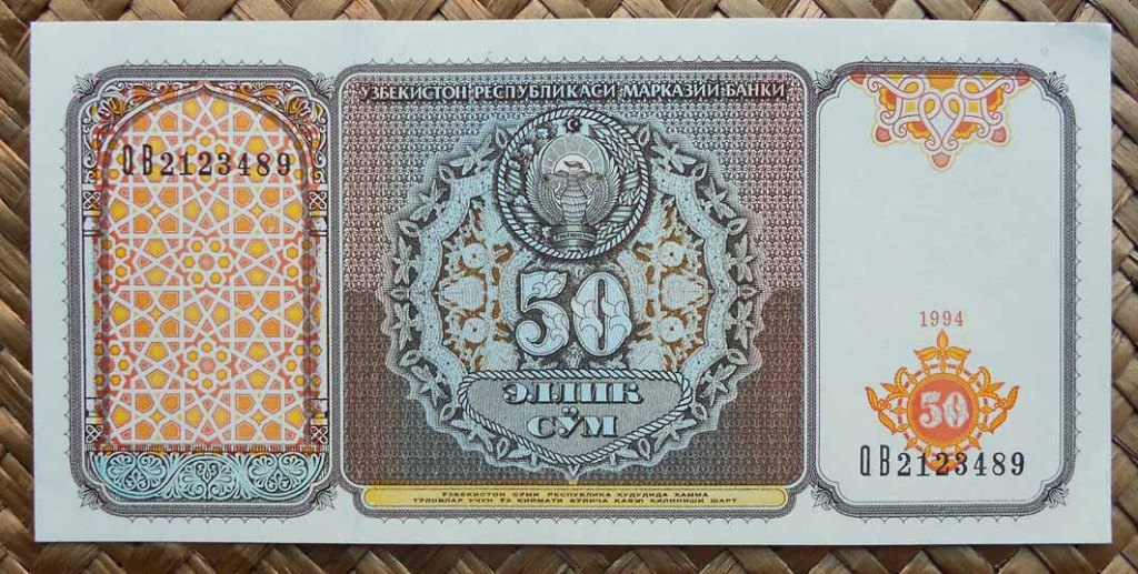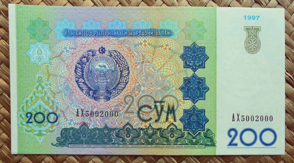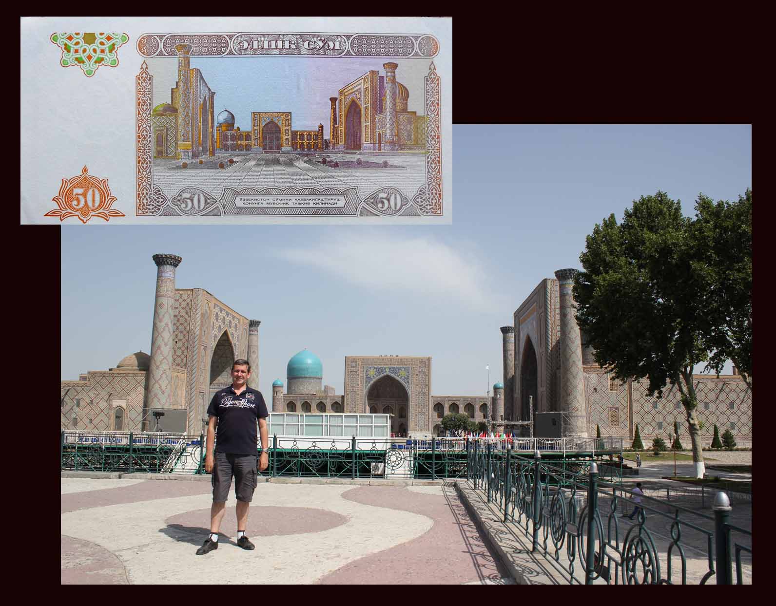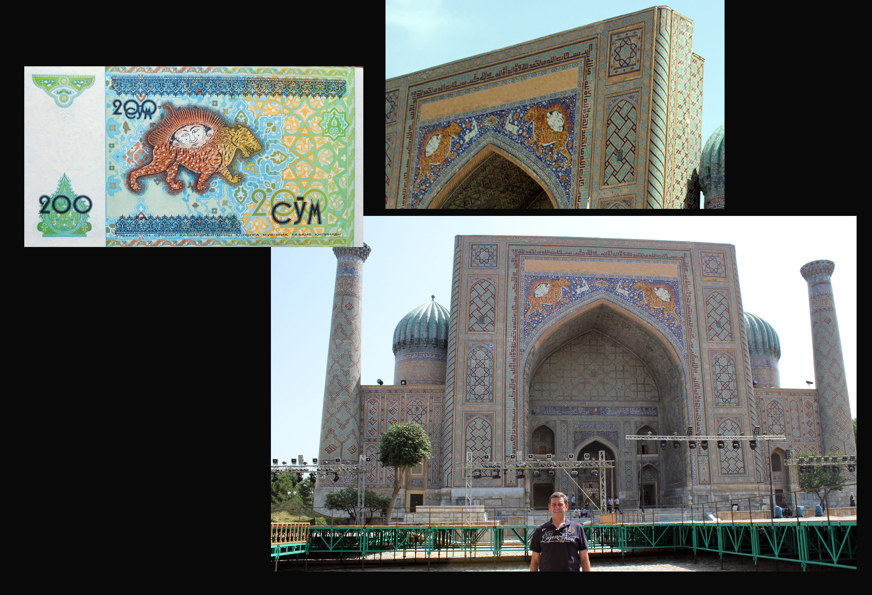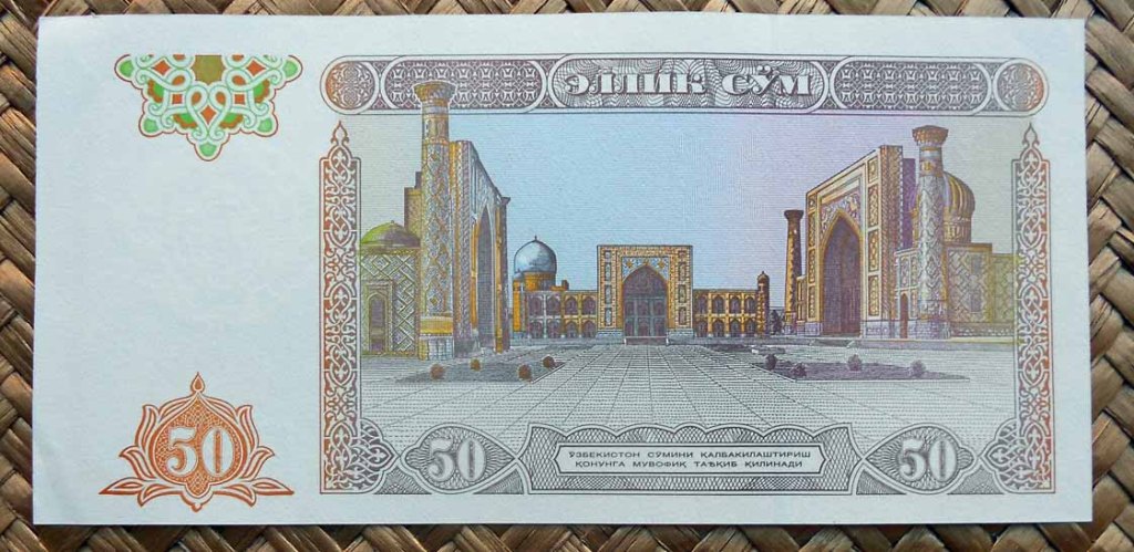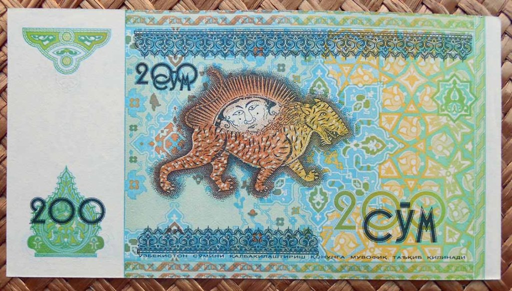También podemos contemplar parte de los azulejos de la puerta de la madrasa Sher Dor con la representación de dos coloristas tigres dorados en sendos laterales de su arco o pishtak; cuyo grabado se nos muestra en el reverso del billete de 200 som de 1997. Estos dos mosaicos paradójicamente nos muestran animales, raro en construcciones musulmanas sobre edificios religiosos donde excluyen la representación de seres vivos.