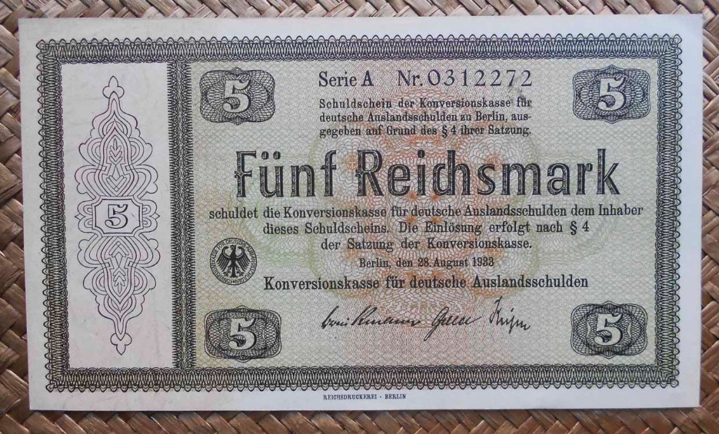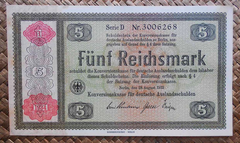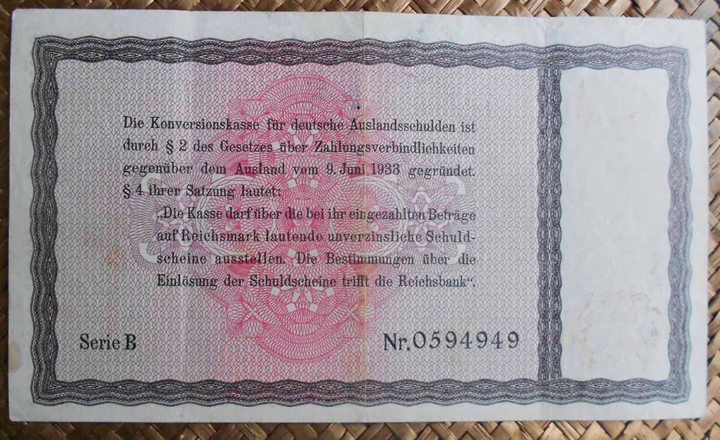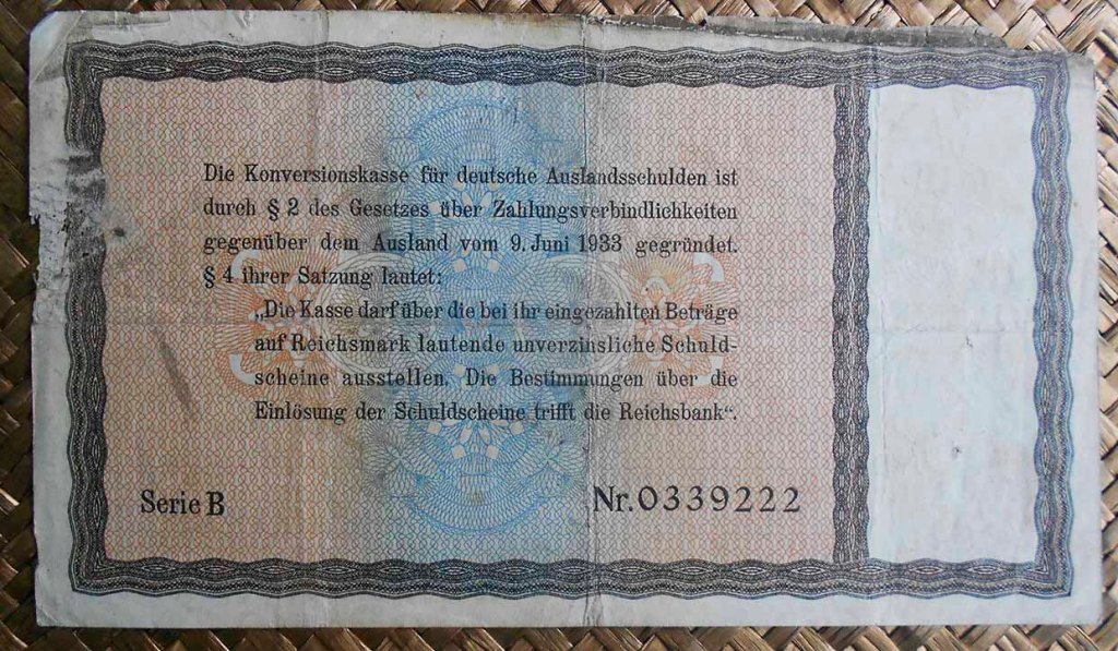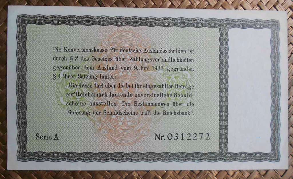 Coetáneamente al nombramiento de Adolf Hitler como canciller de Alemania, en 1933, verían la luz unos peculiares billetes pagarés que iban a formar parte de los fondos de conversión para la deuda externa alemana. Esta especie de certificados de deuda externa fueron emitidos por el Reichsbank, que en esa fecha aún era una institución independiente del gobierno del Tercer Reich. Estas notas se emitieron de 1933 a 1935 para refugiados predominantemente judíos, que recibían estos billetes como pago por las propiedades que les confiscaban.